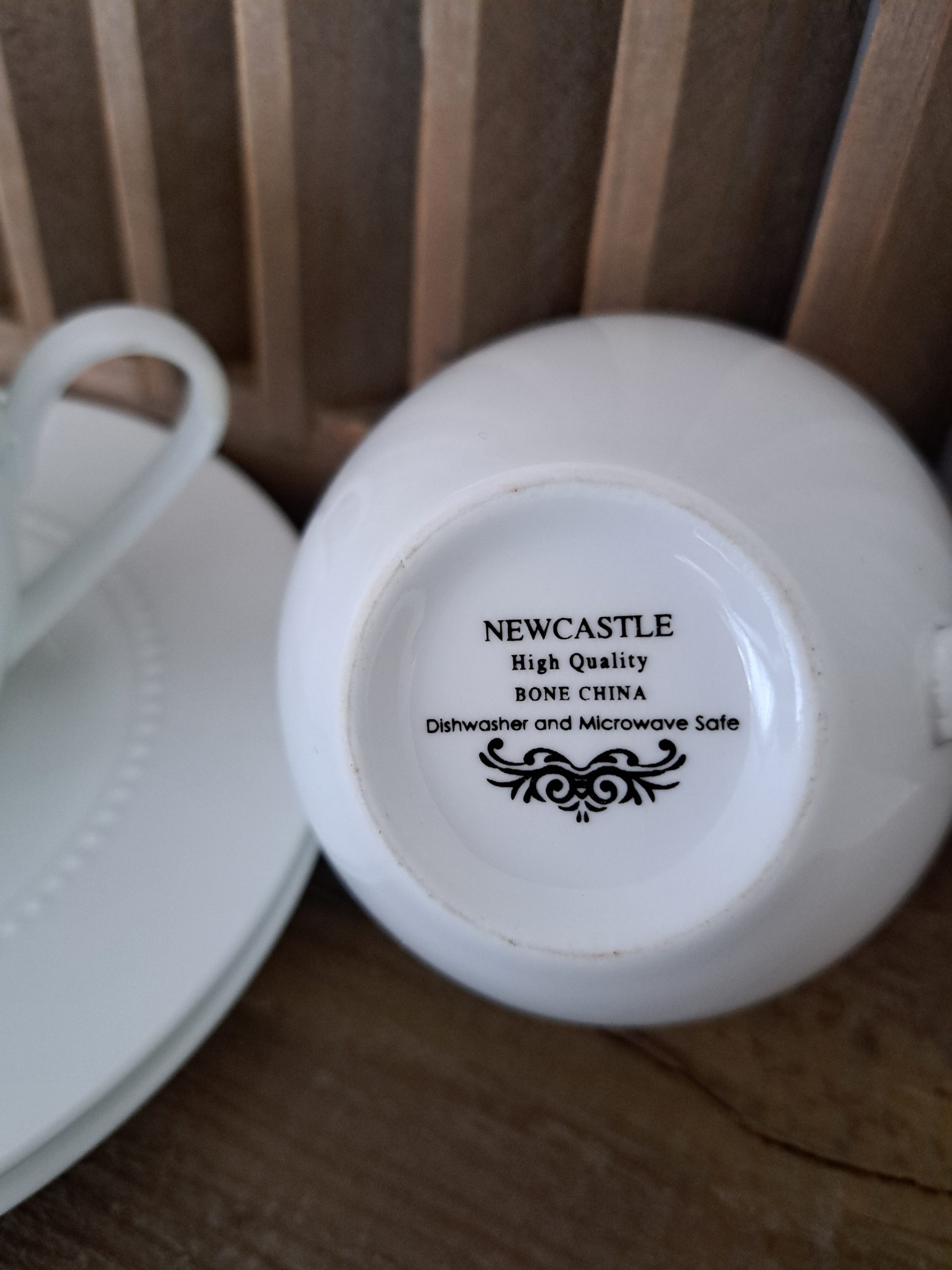 kop en schotel van New Castle, High Quality Bone China. Beide sets zijn in perfecte staat.