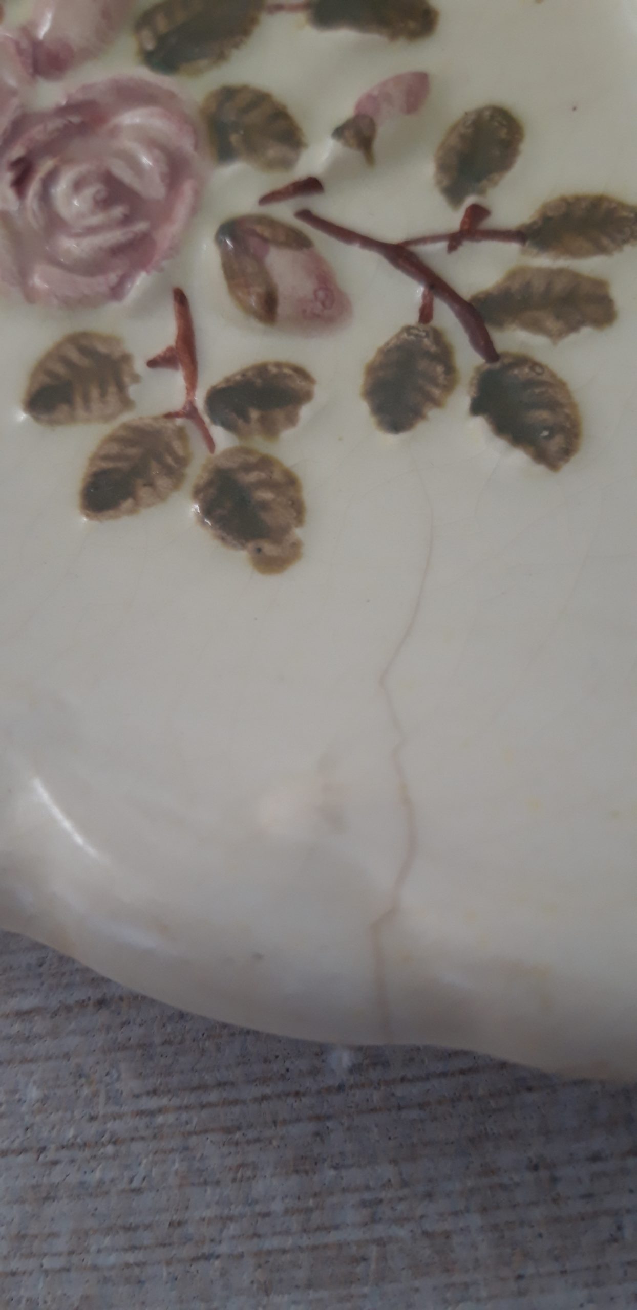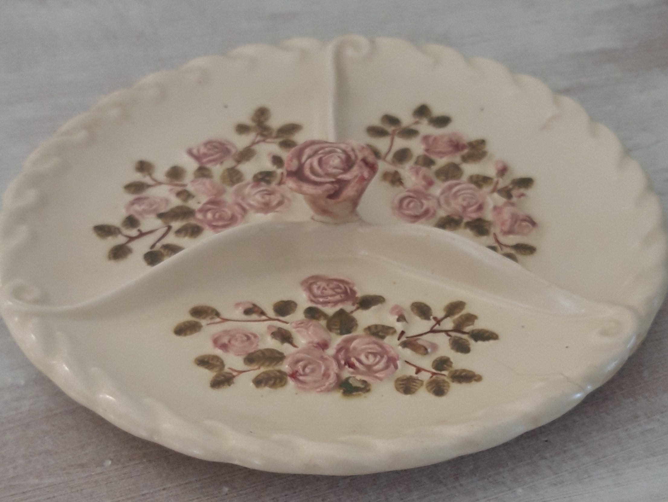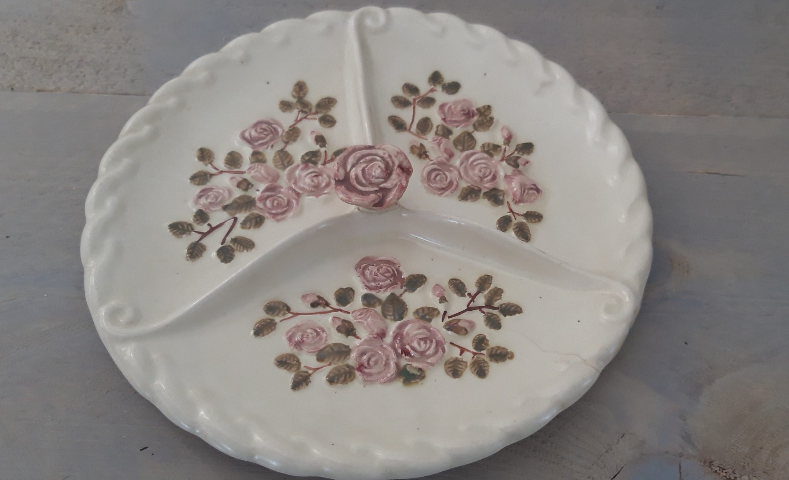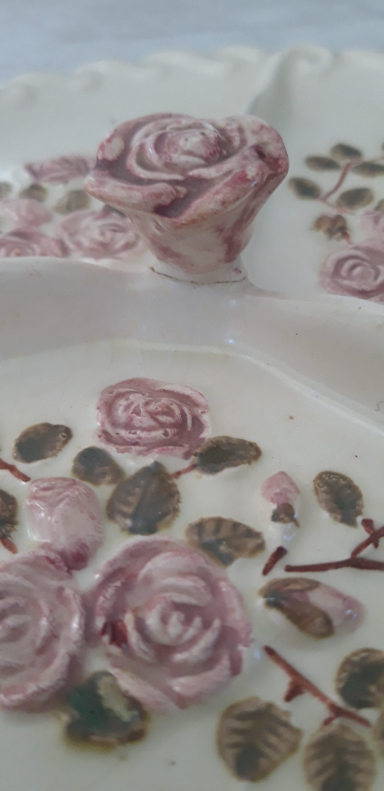 Mooi bordje met 3 vakken voor b.v. bonbons of koekjes maar ook zonder iets er op erg decoratief. De roosjes liggen als een reliëf op het bordje . In het midden staat een stenen roosje. Er zit een klein haarscheurtje in. De doorsnee is 22 cm.