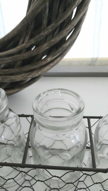 Brocante draadmandje met 3 glazen flesjes. 1 Flesje heeft bovenop een beschadiging ( zie foto ) Afmeting L18xBR6.