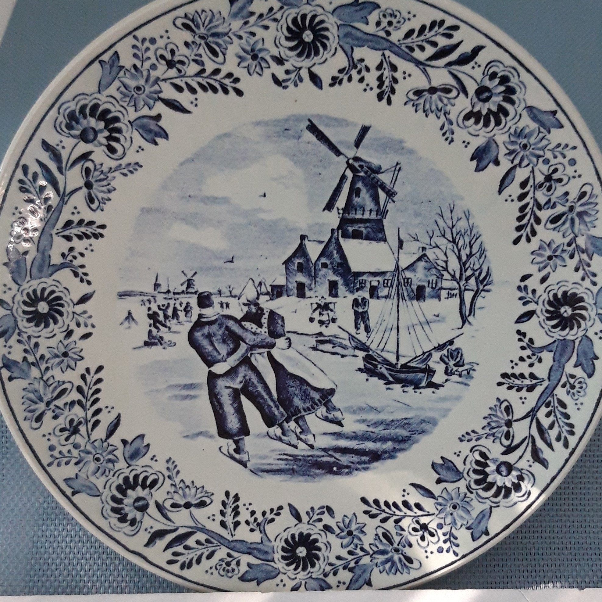 Bord “made for Royal Sfinx by Boch” . Oud Hollandse afbeelding van schaatsend koppel met molen op achtergrond.