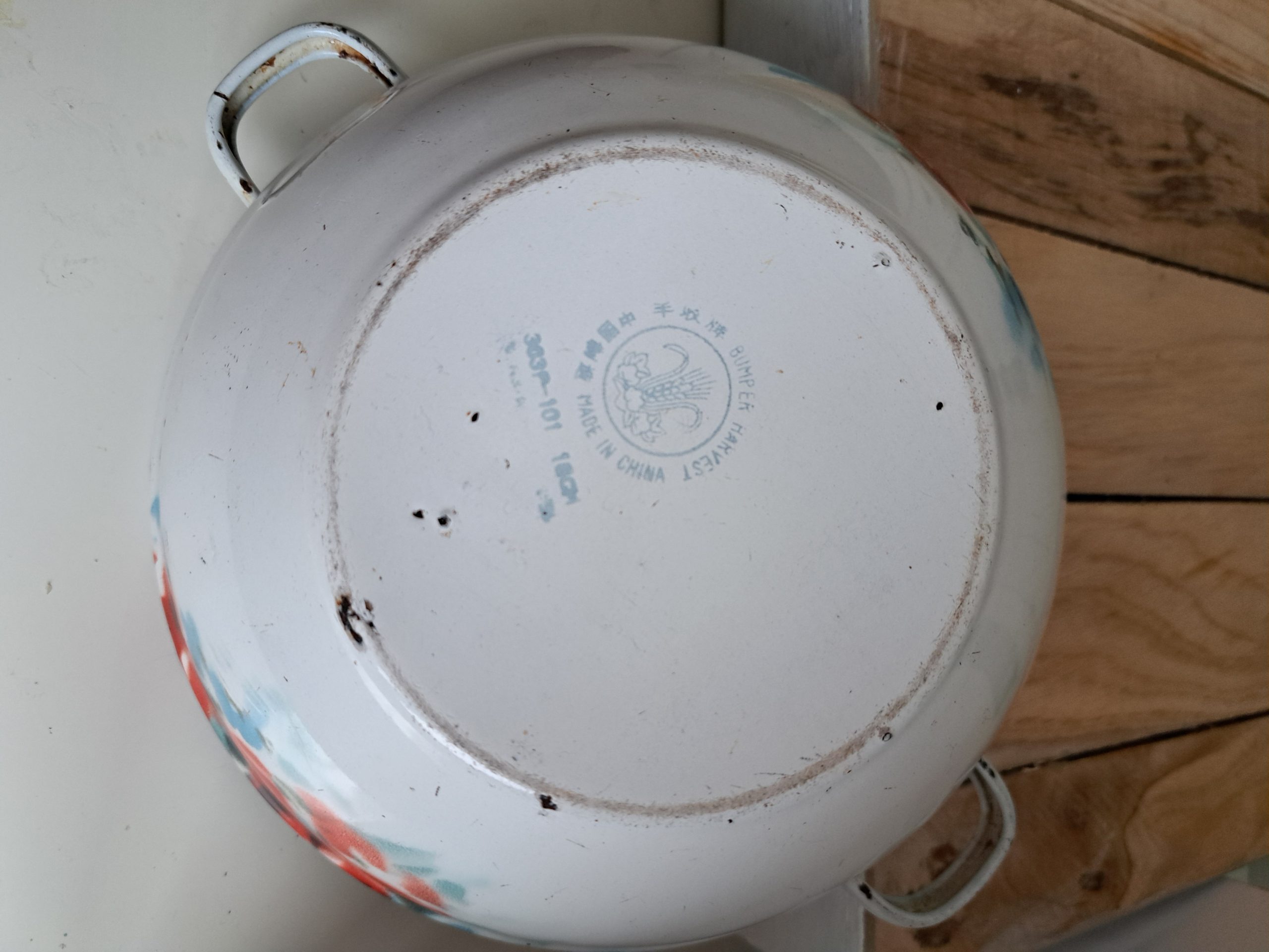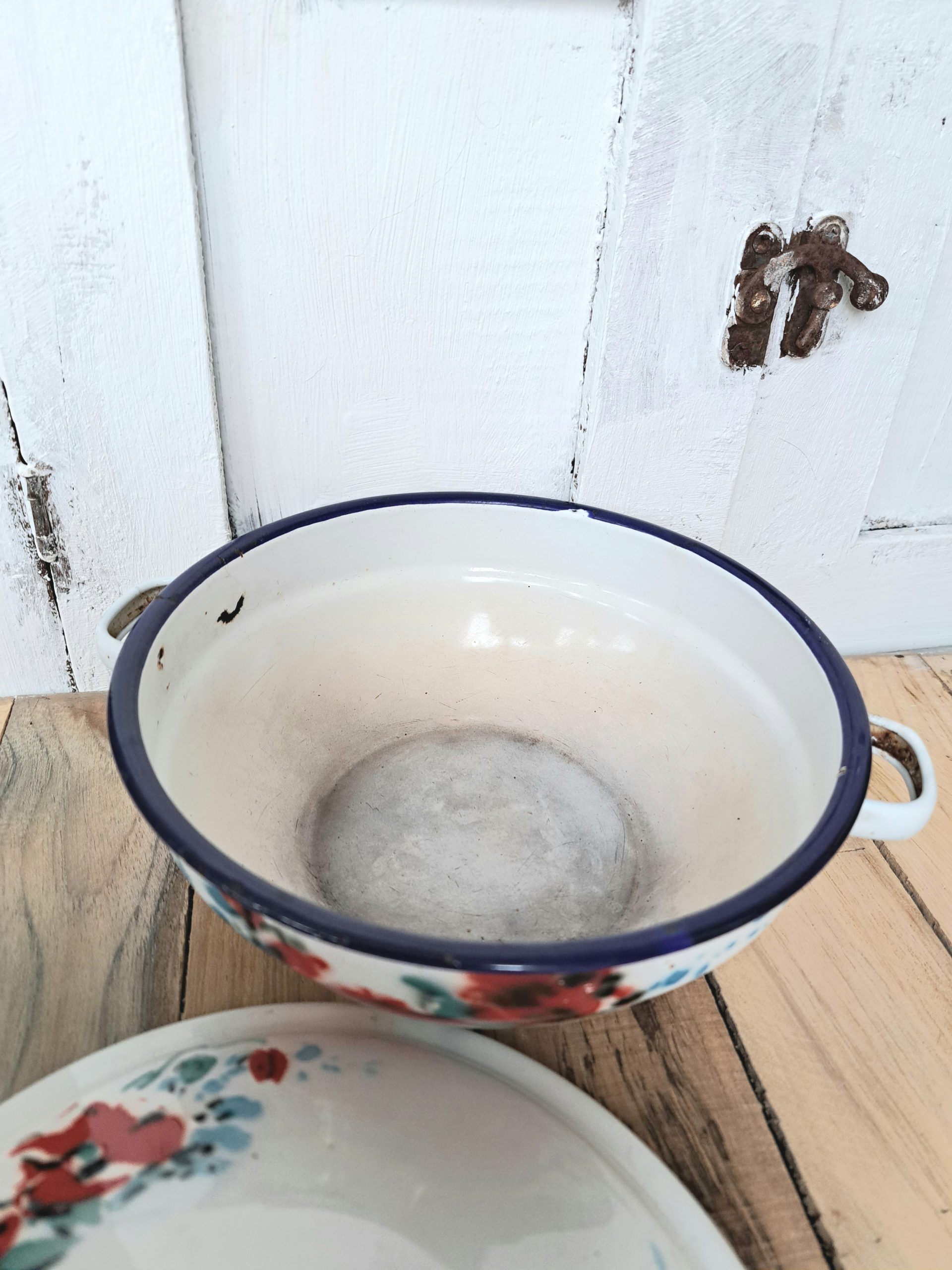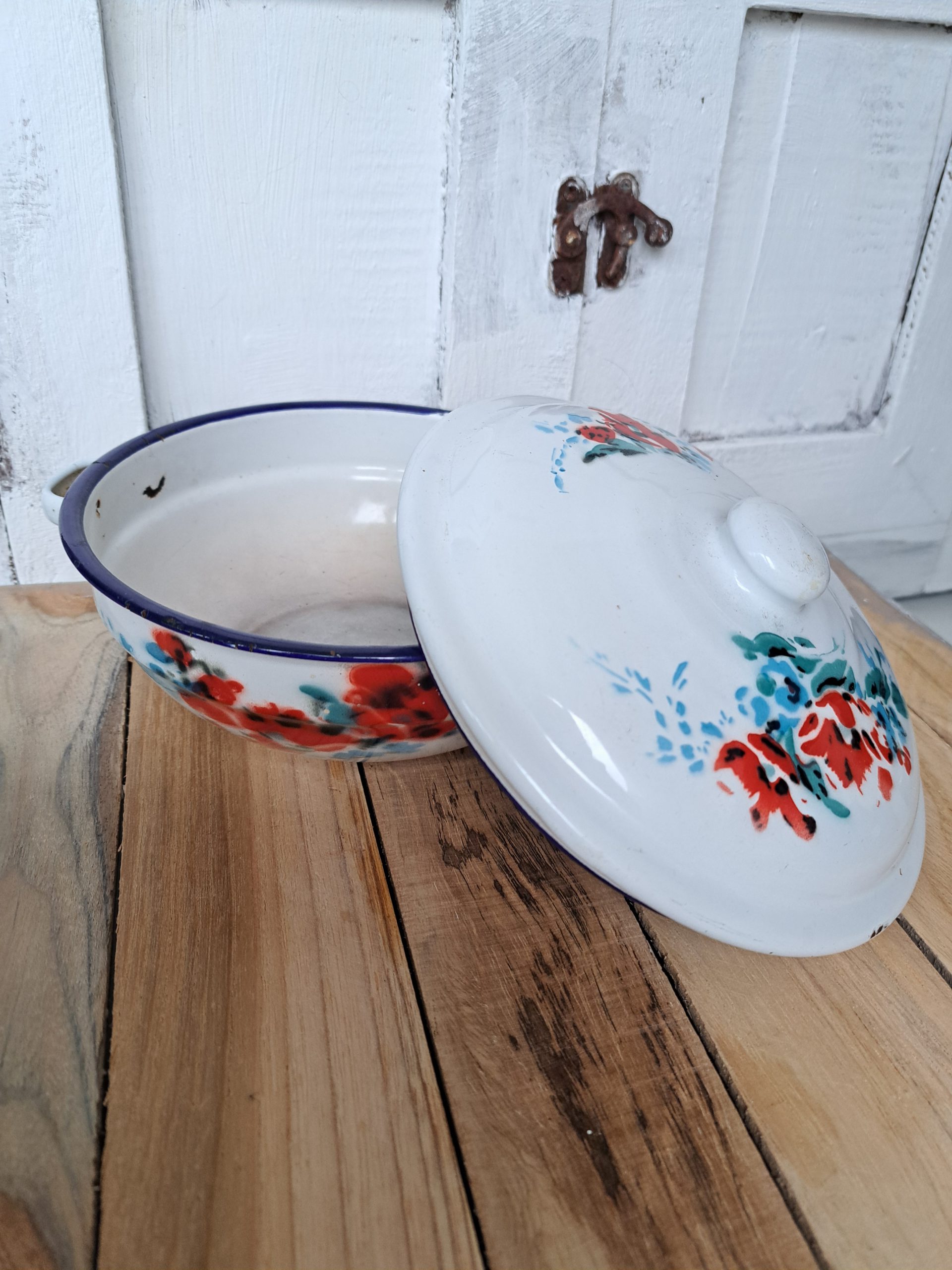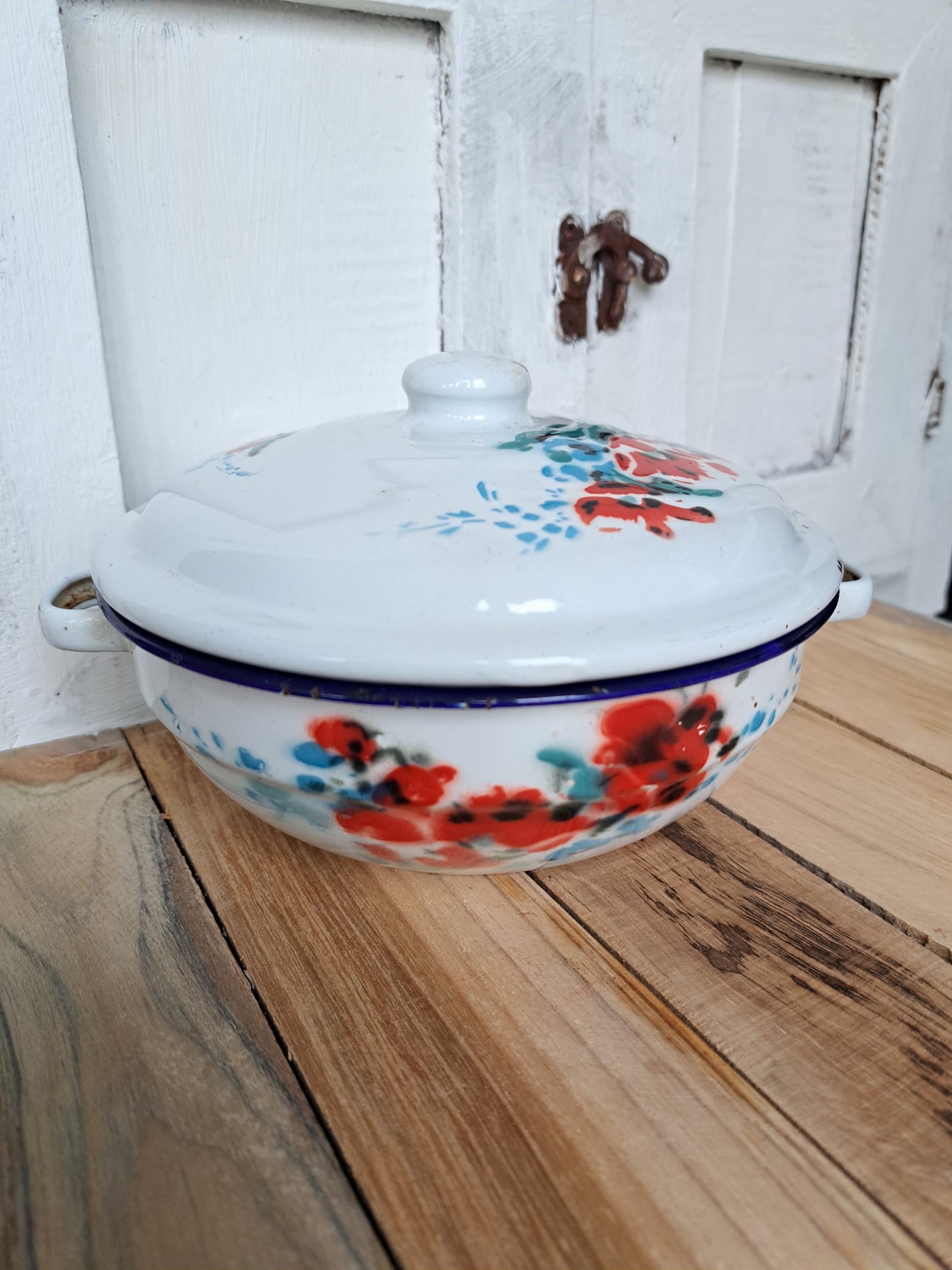 Dekschaaltje van email. Wit met rode bloemen. Diameter 17 cm (zonder greepjes gemeten) Diameter bodem 10cm