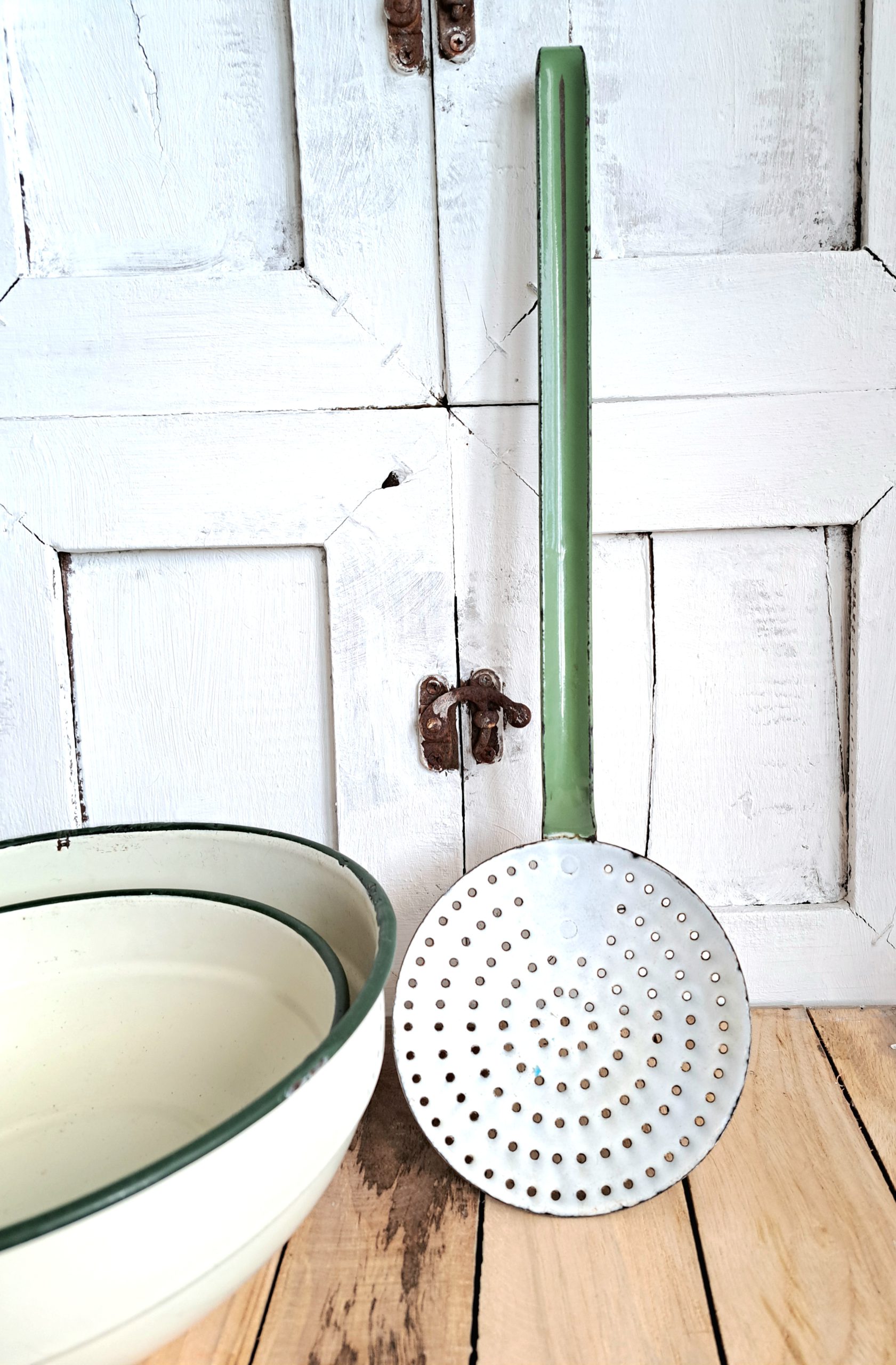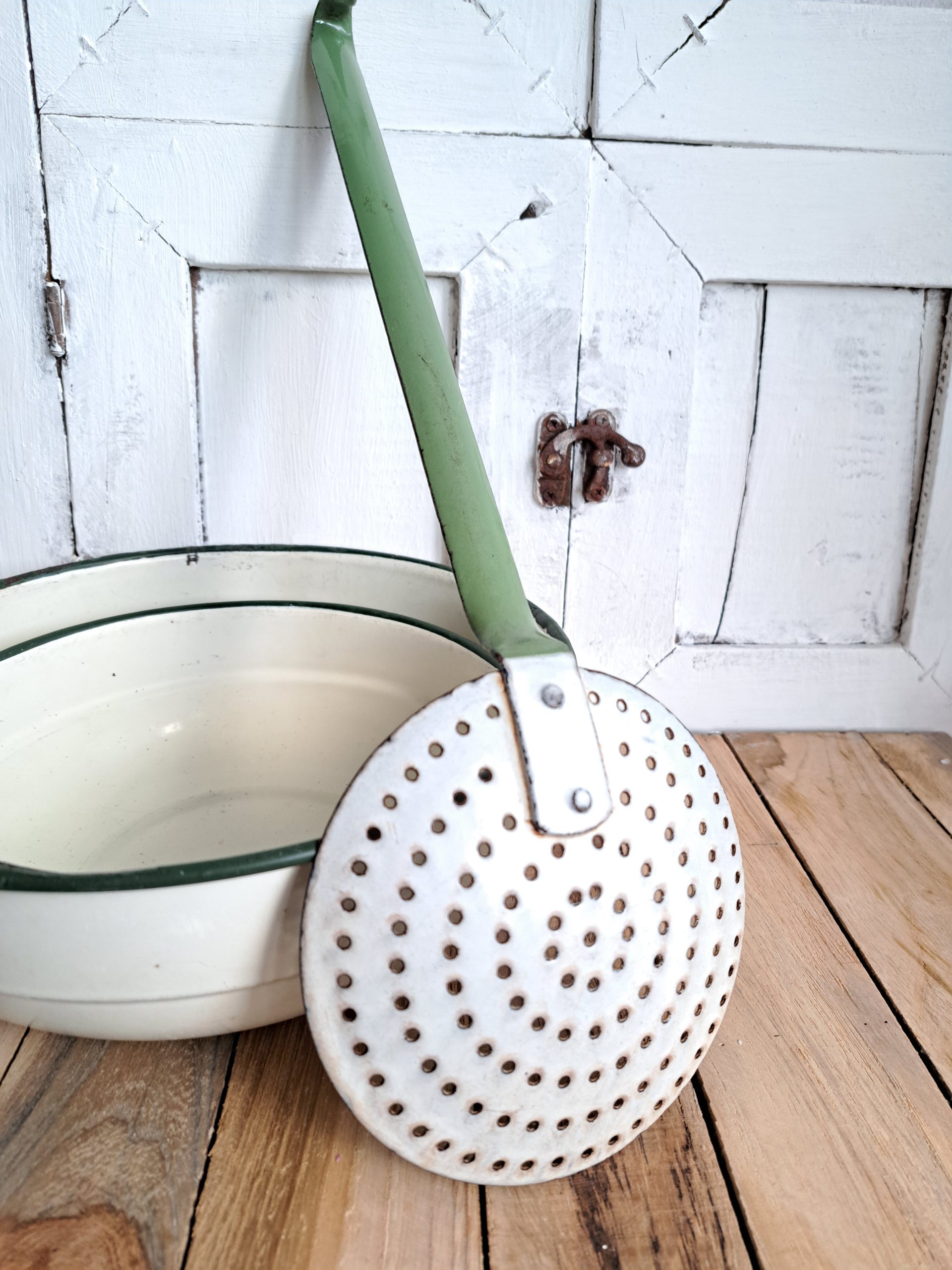 Oude emaille schuimspaan in reseda groen en wit. Lengte van de steel is 27 cm. Totale lengte 39 cm.