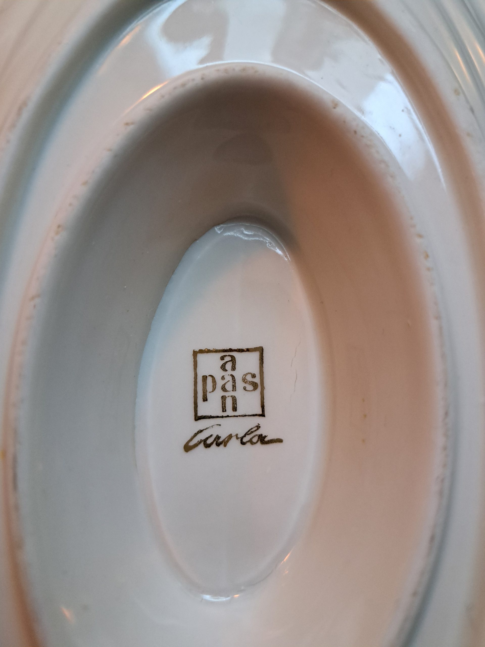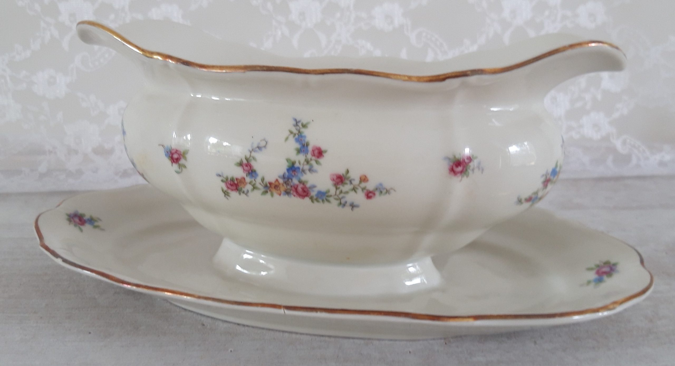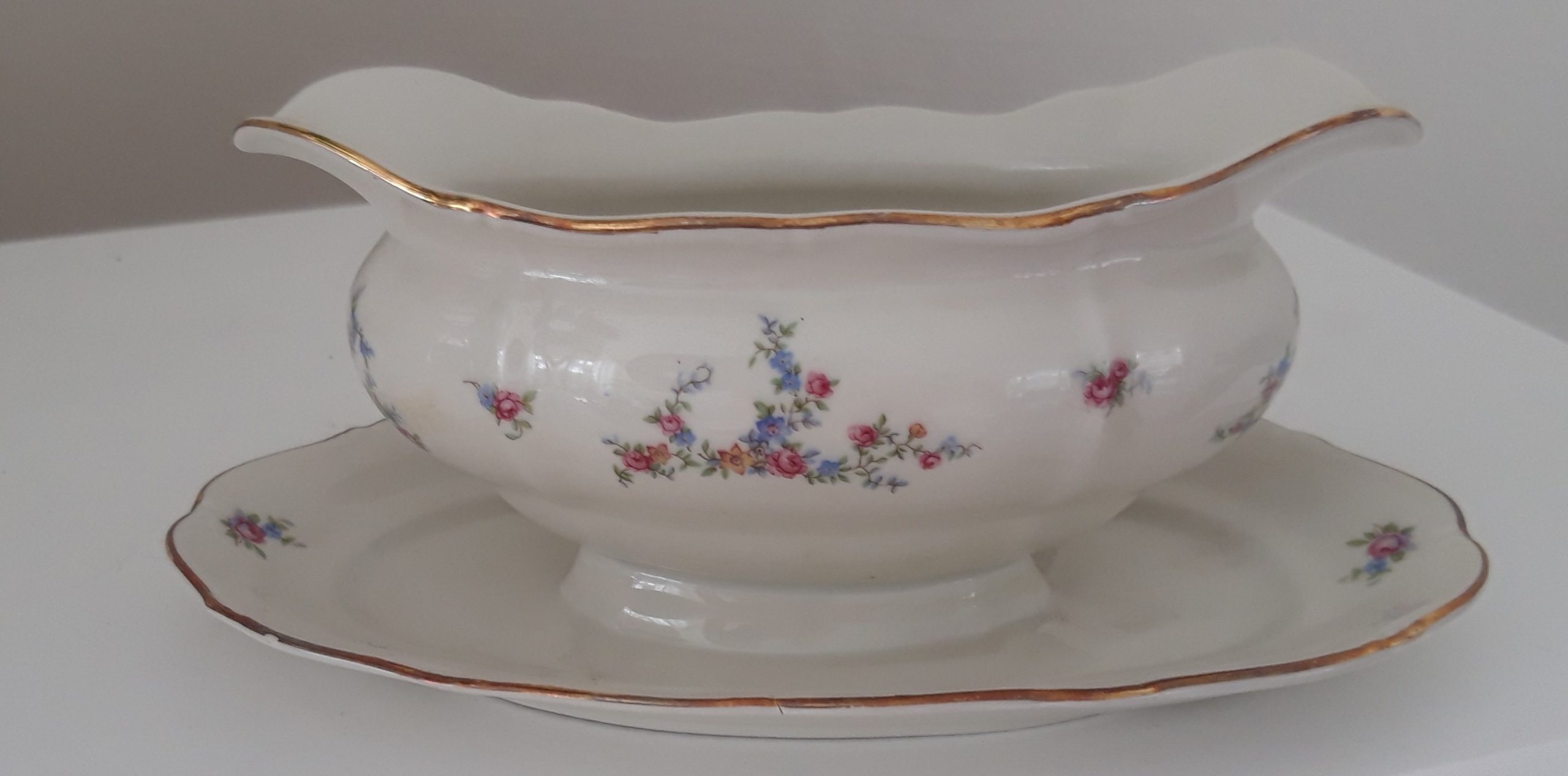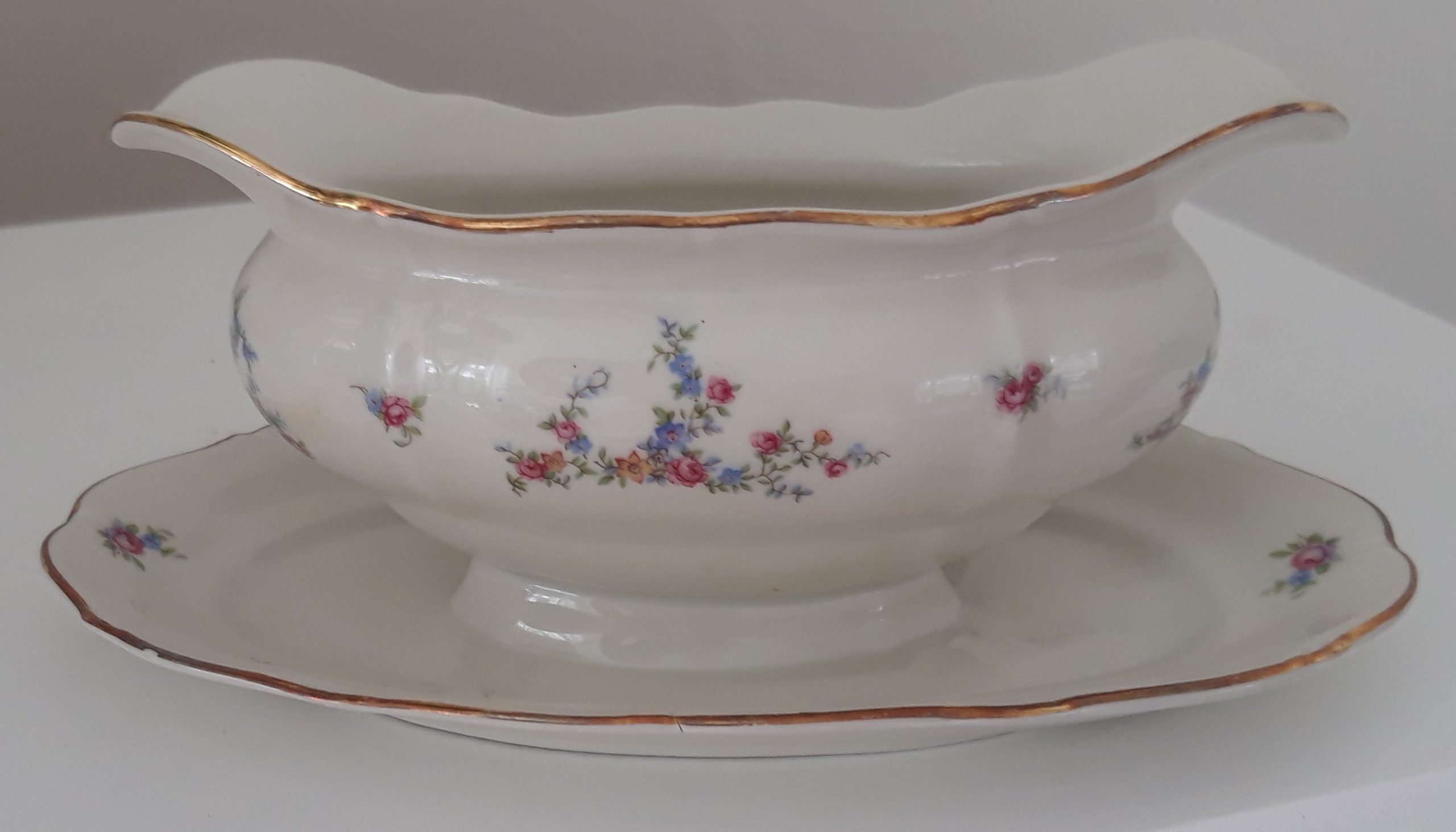 Sauskom Pas Aan Carla in roomwit met sierlijk kleine roosjes en gouden bies op de bovenrand en de rand van de vaste schaal. De kom is puntgaaf.
