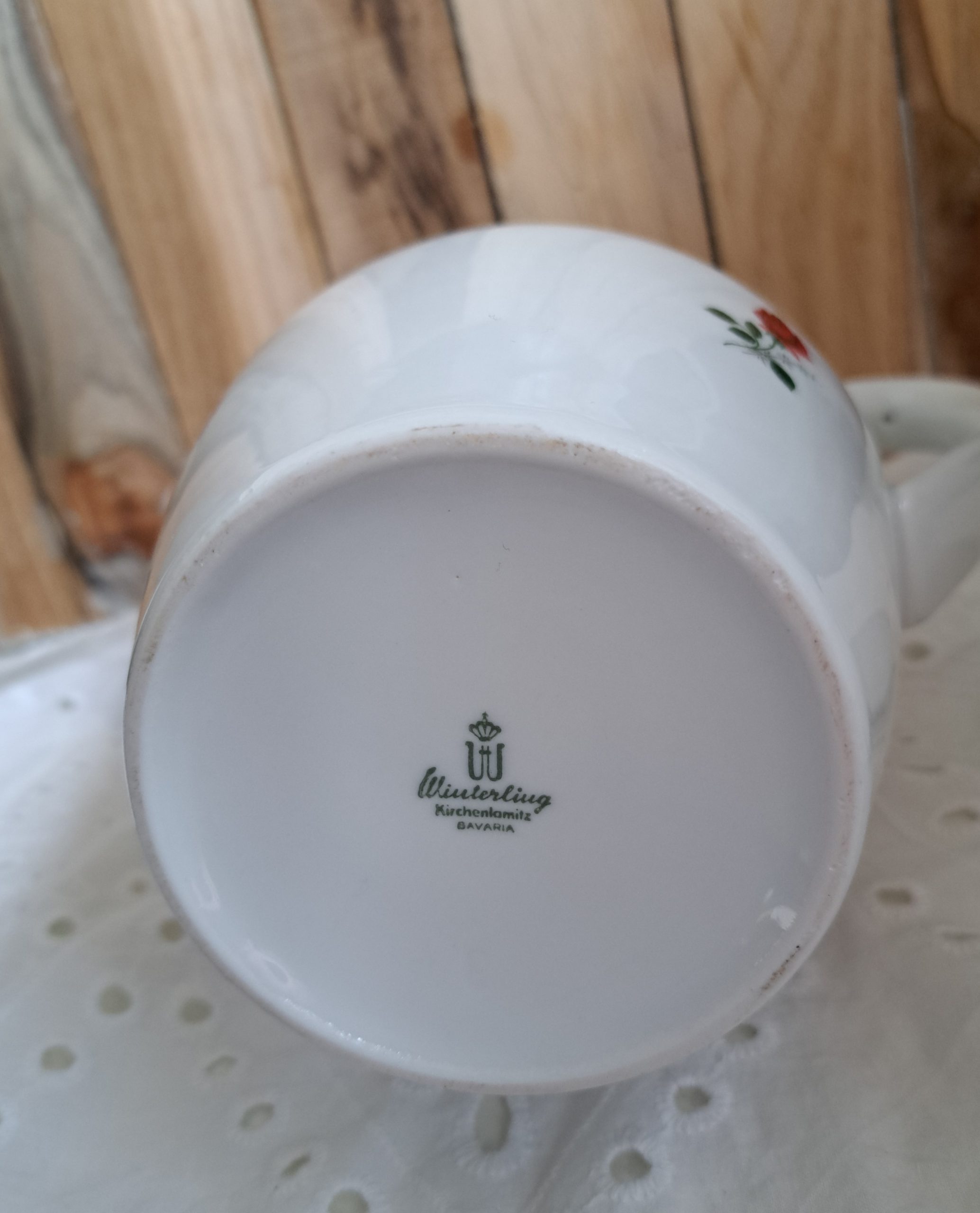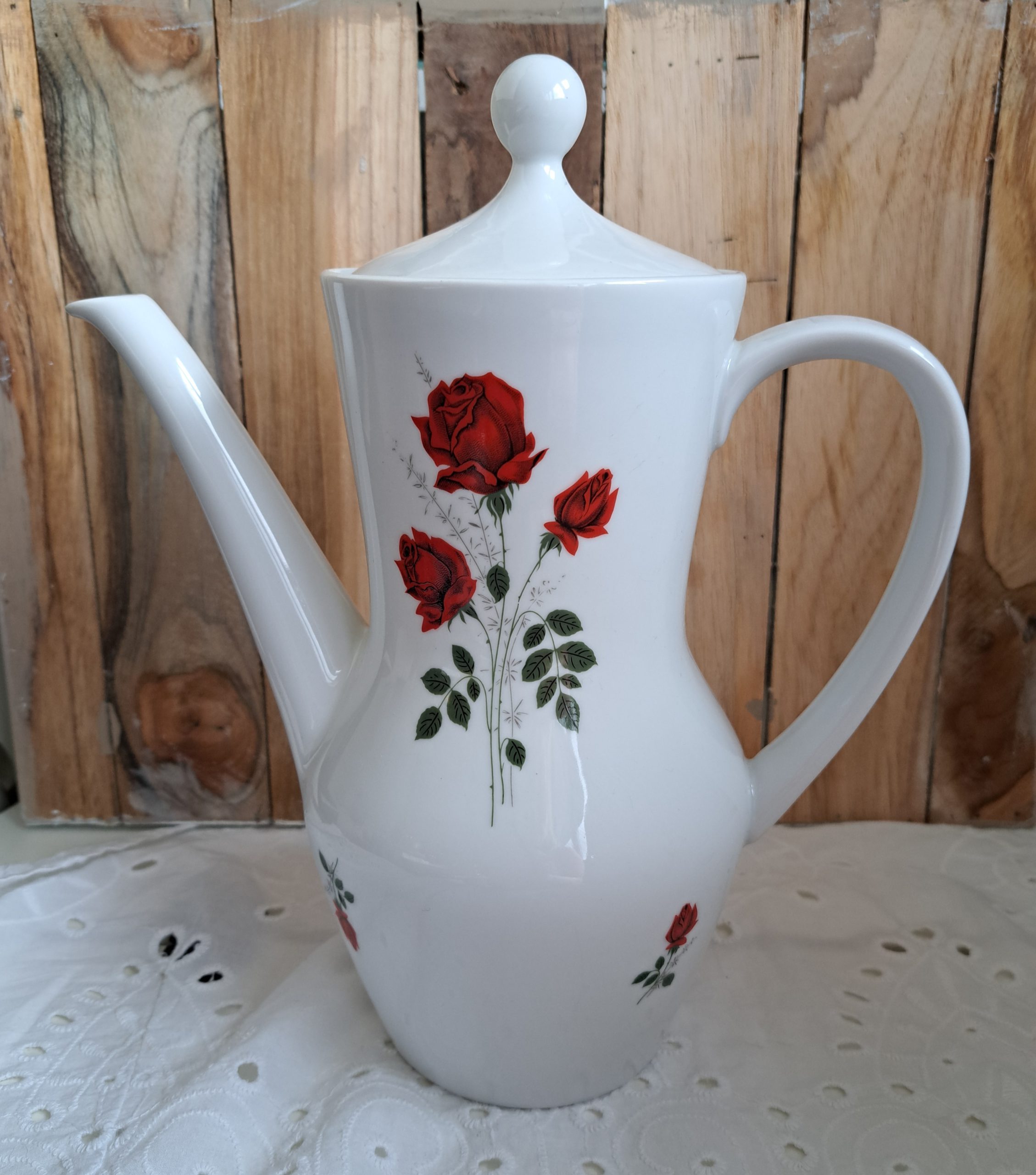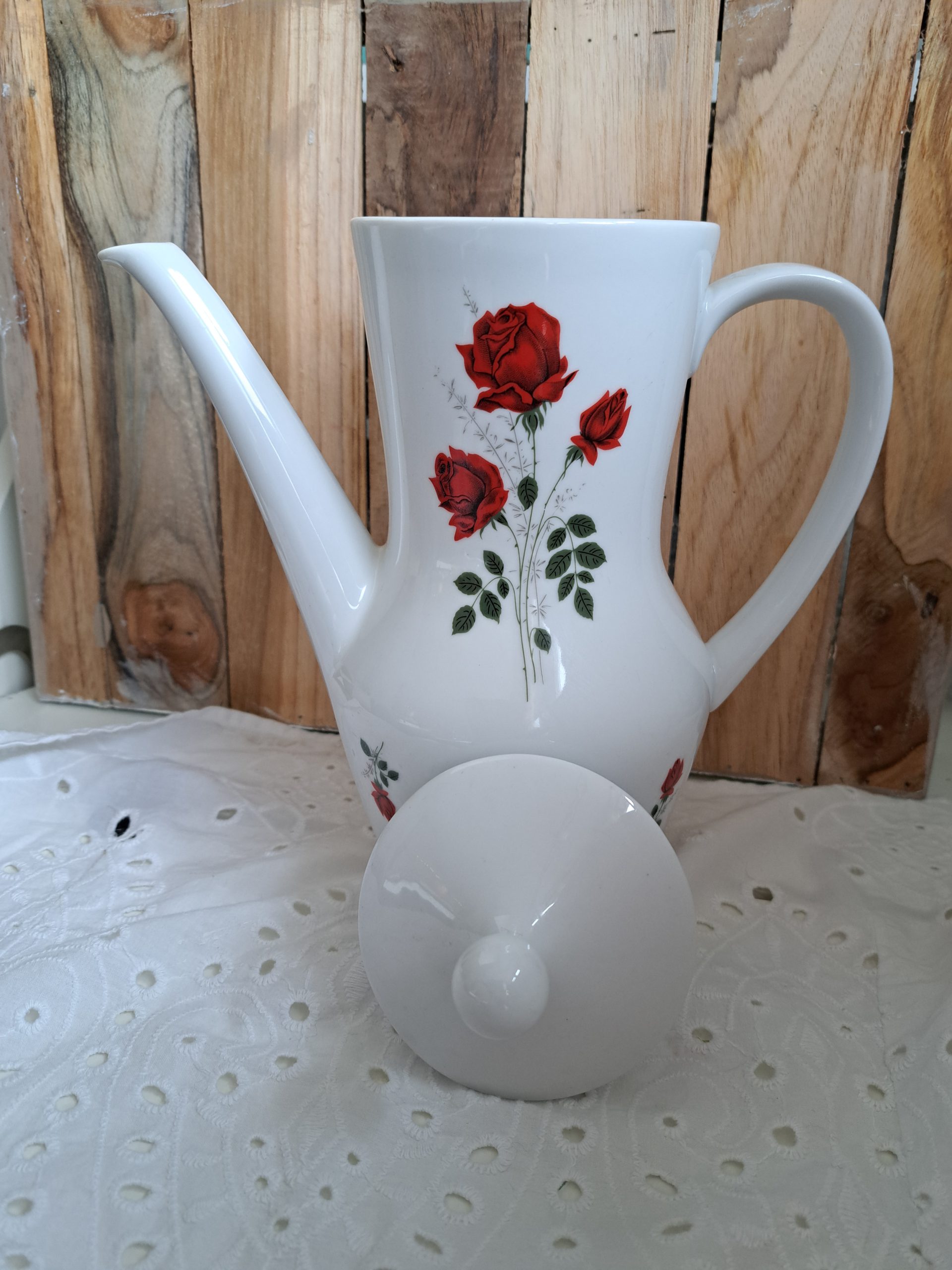 Een hele mooie koffiepot in het wit met rode roosjes en groene blaadjes van Winterling Kirchenlamitz.