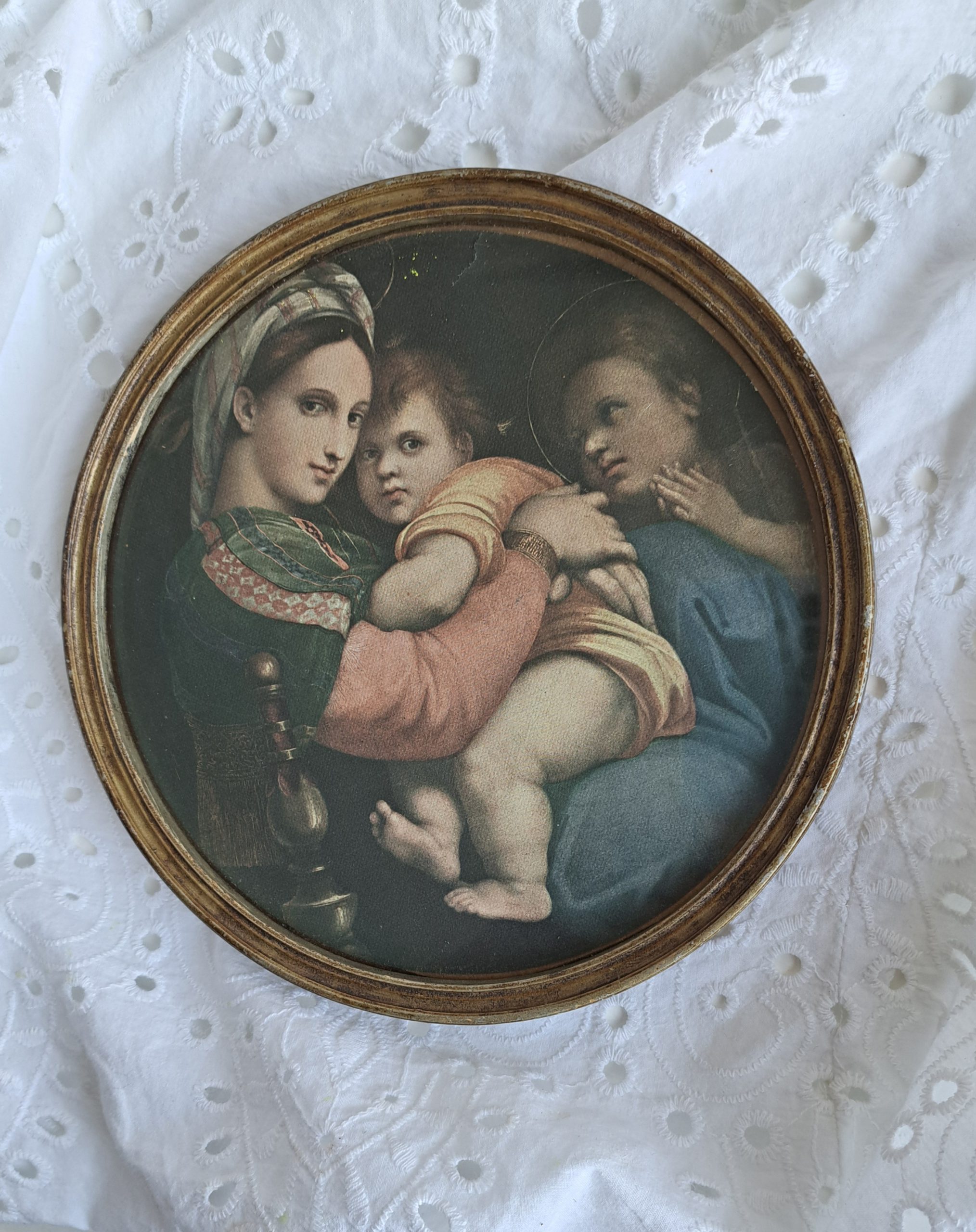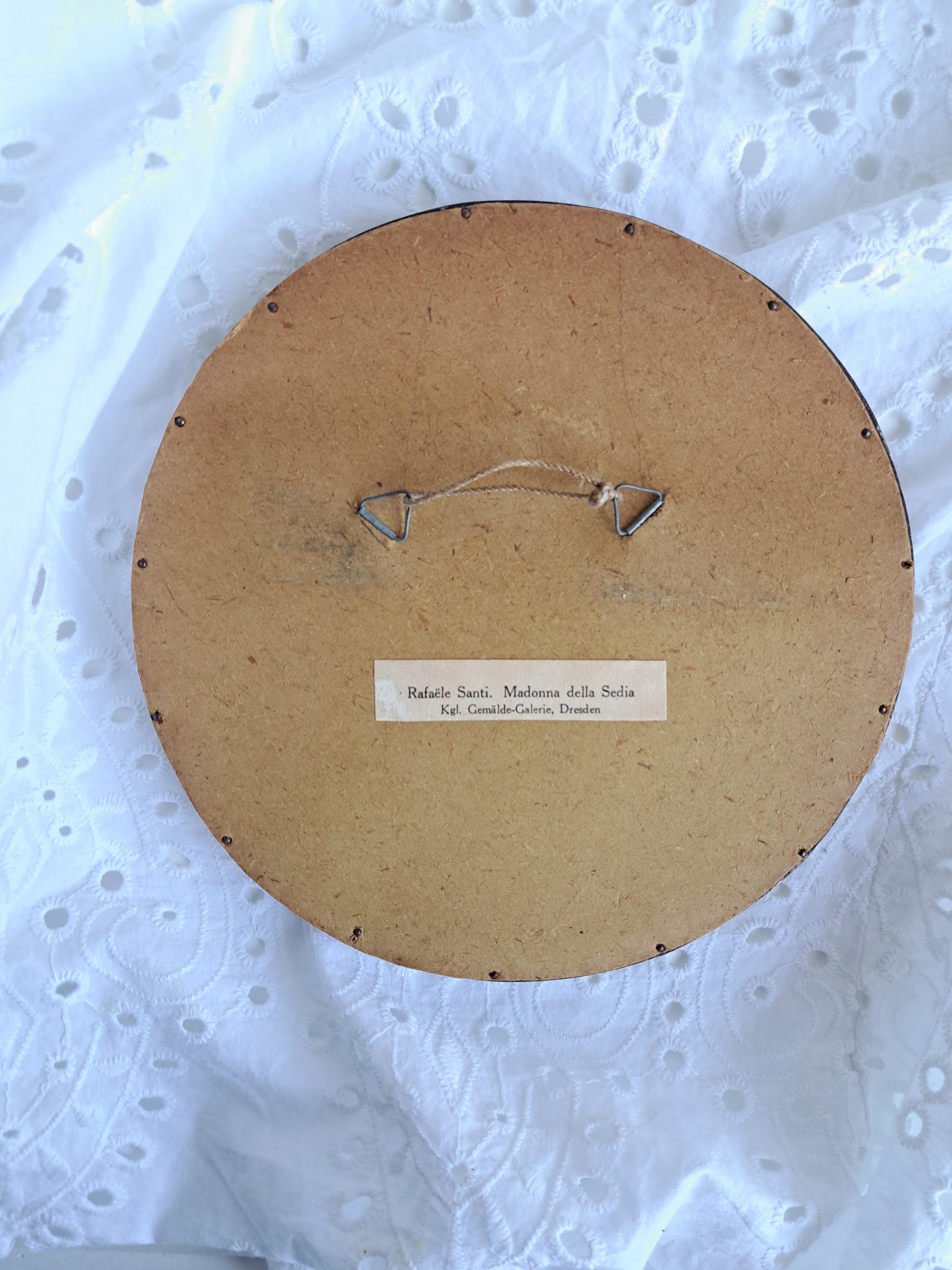 Ingelijste prent van Madonna Della Sedia van Rafaële Santi. De prent zit in een ronde houten lijst. Ø 19,5 cm