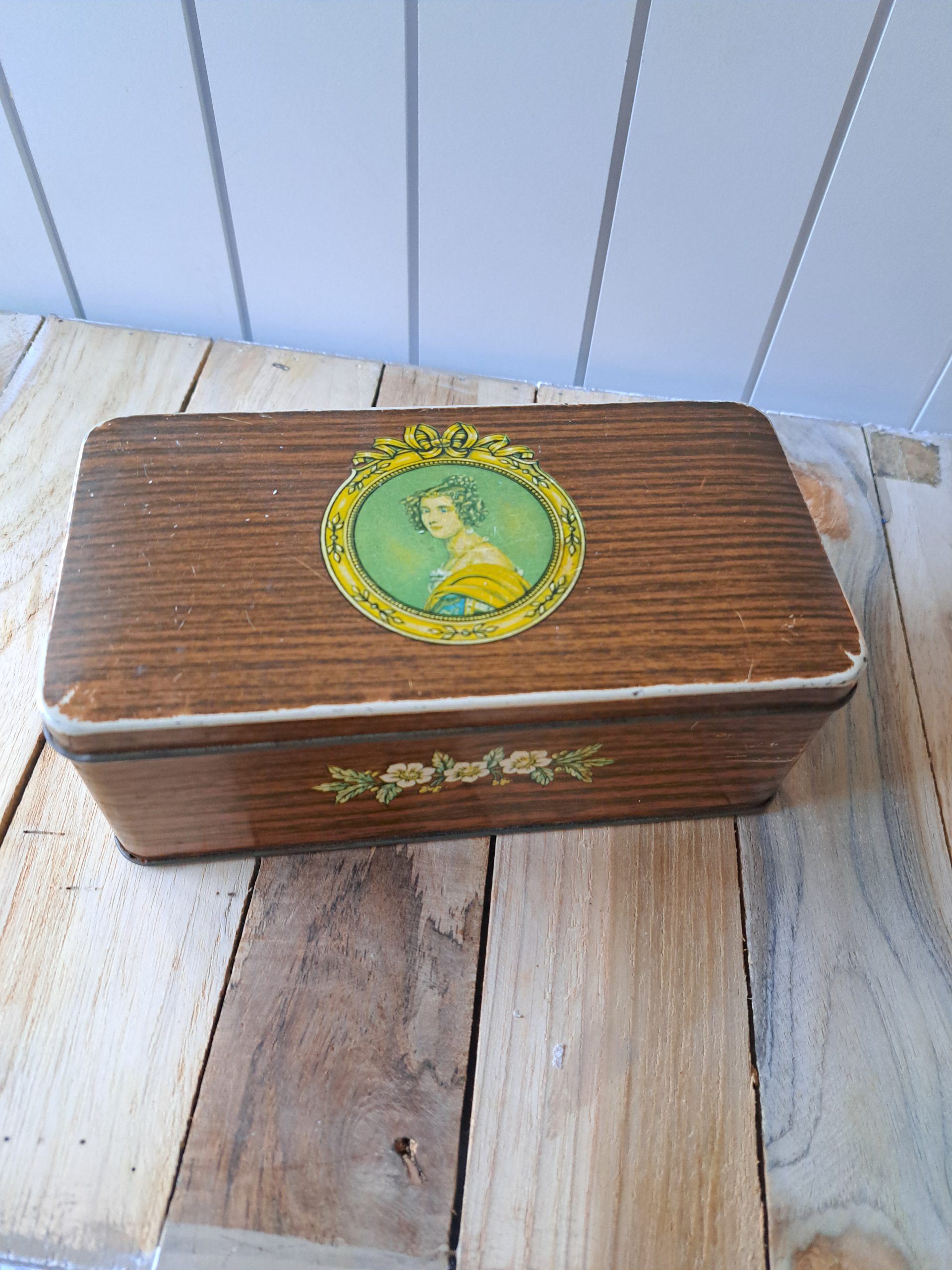 Langwerpig oud blik, heeft gebruikers sporen. L x BR x H = 17 x 9 x 6,5 cm
