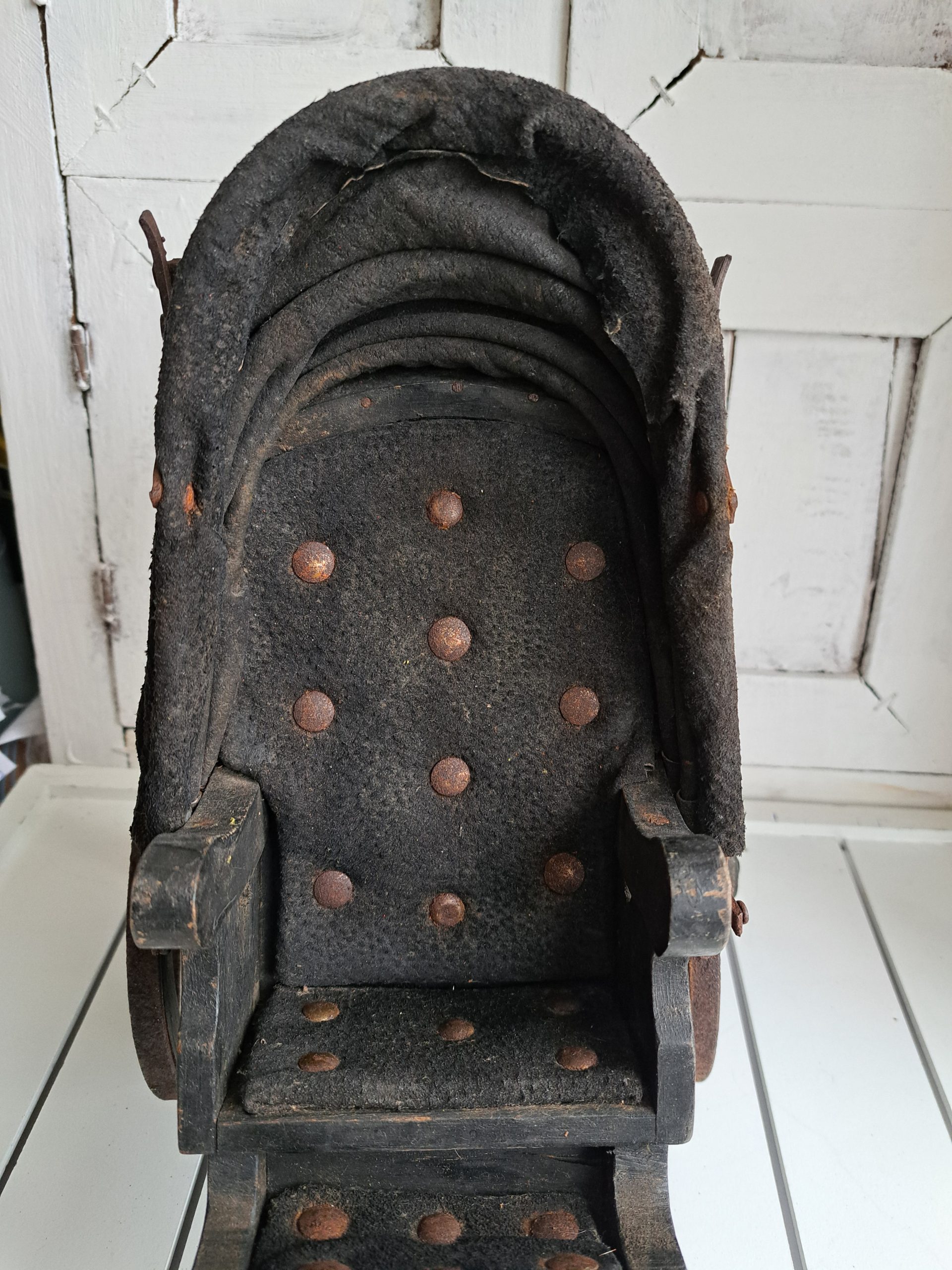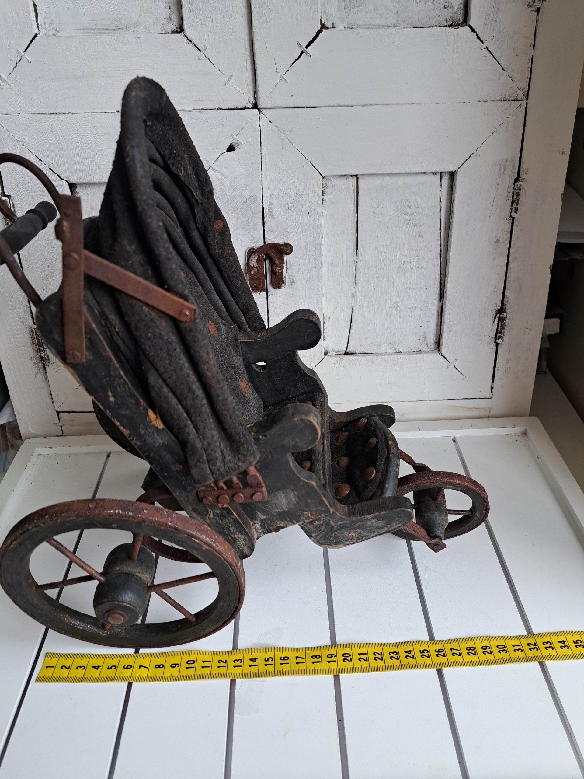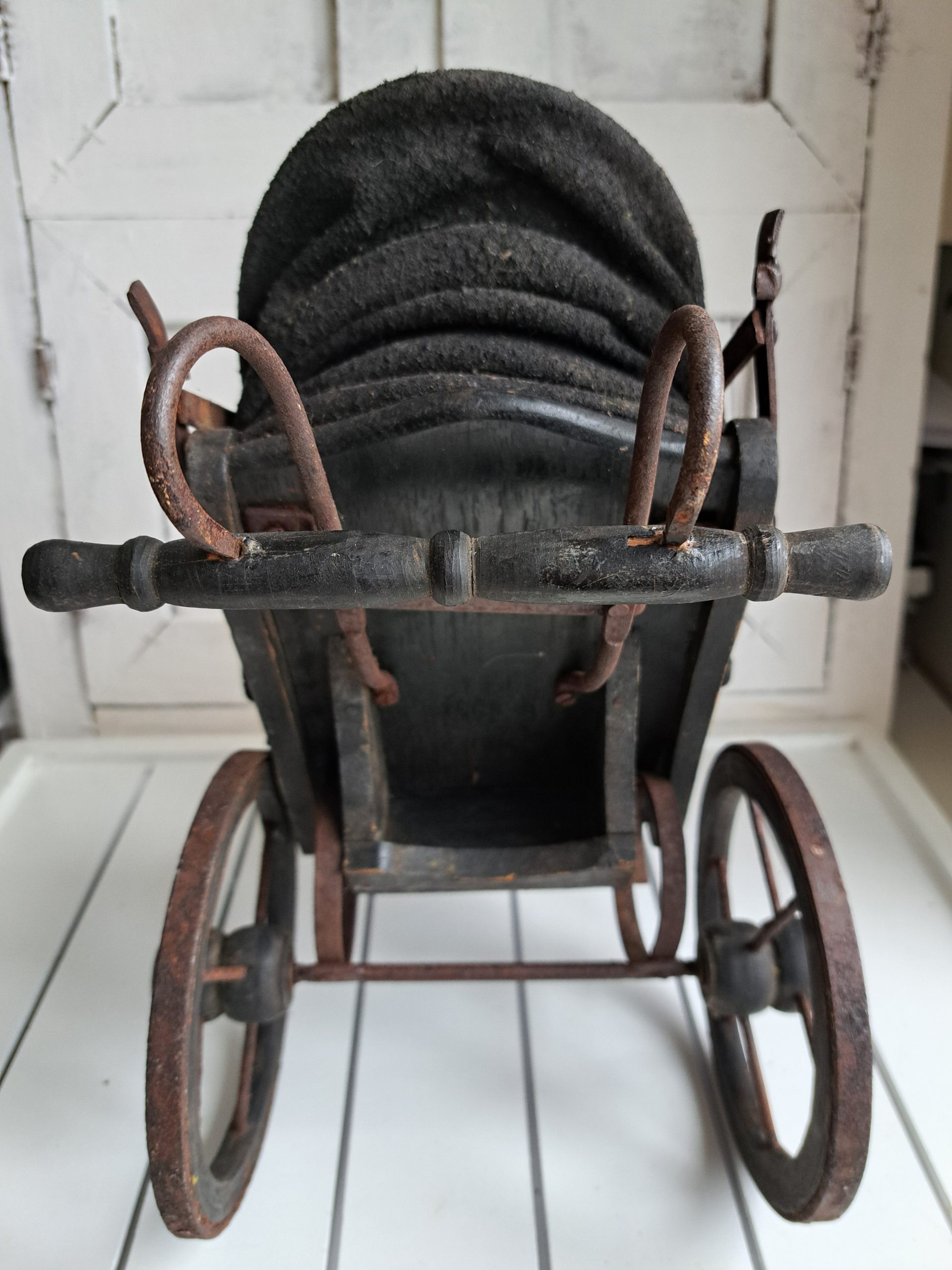 hele oude kleine poppenwagen ter decoratie van hout en metaal. De bekleding is vervaardigd van leer en beslagen met nagels. Het geheel is in oude staat.