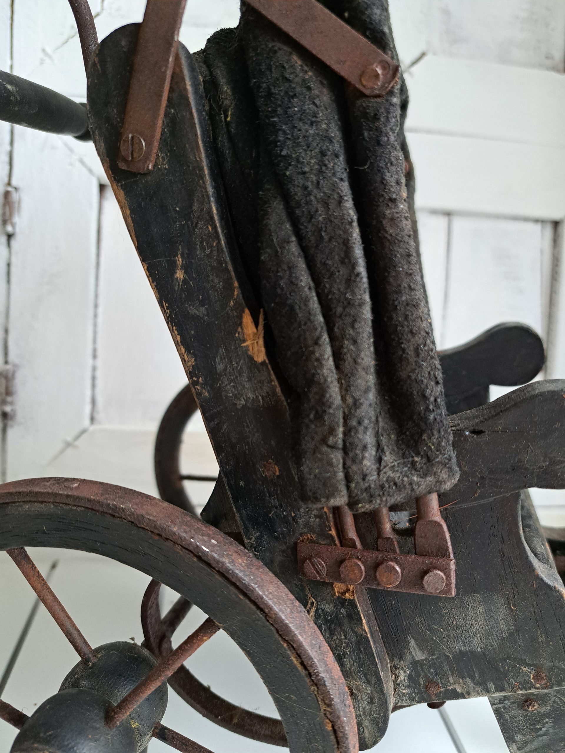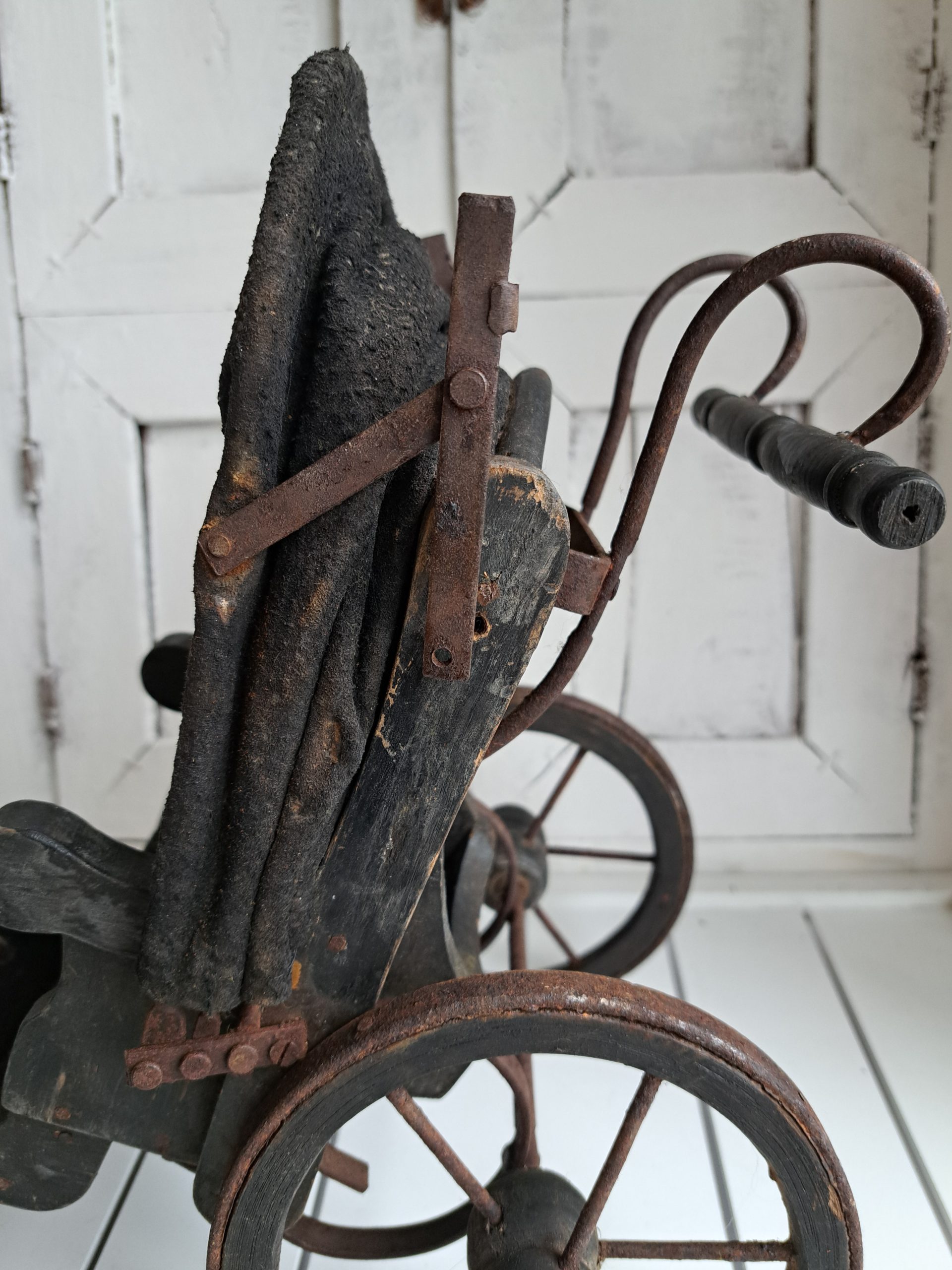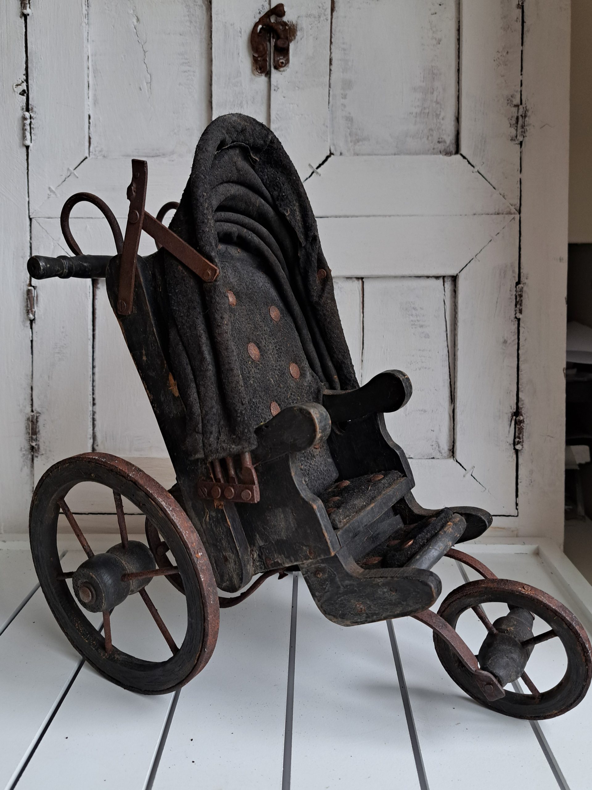 hele oude kleine poppenwagen ter decoratie van hout en metaal. De bekleding is vervaardigd van leer en beslagen met nagels. Het geheel is in oude staat.