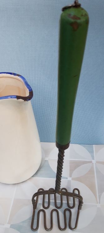 Oude stamper met groen houten steel. lengte is 38 cm, het stampvlak is 9,5 x 8,5 cm groot.