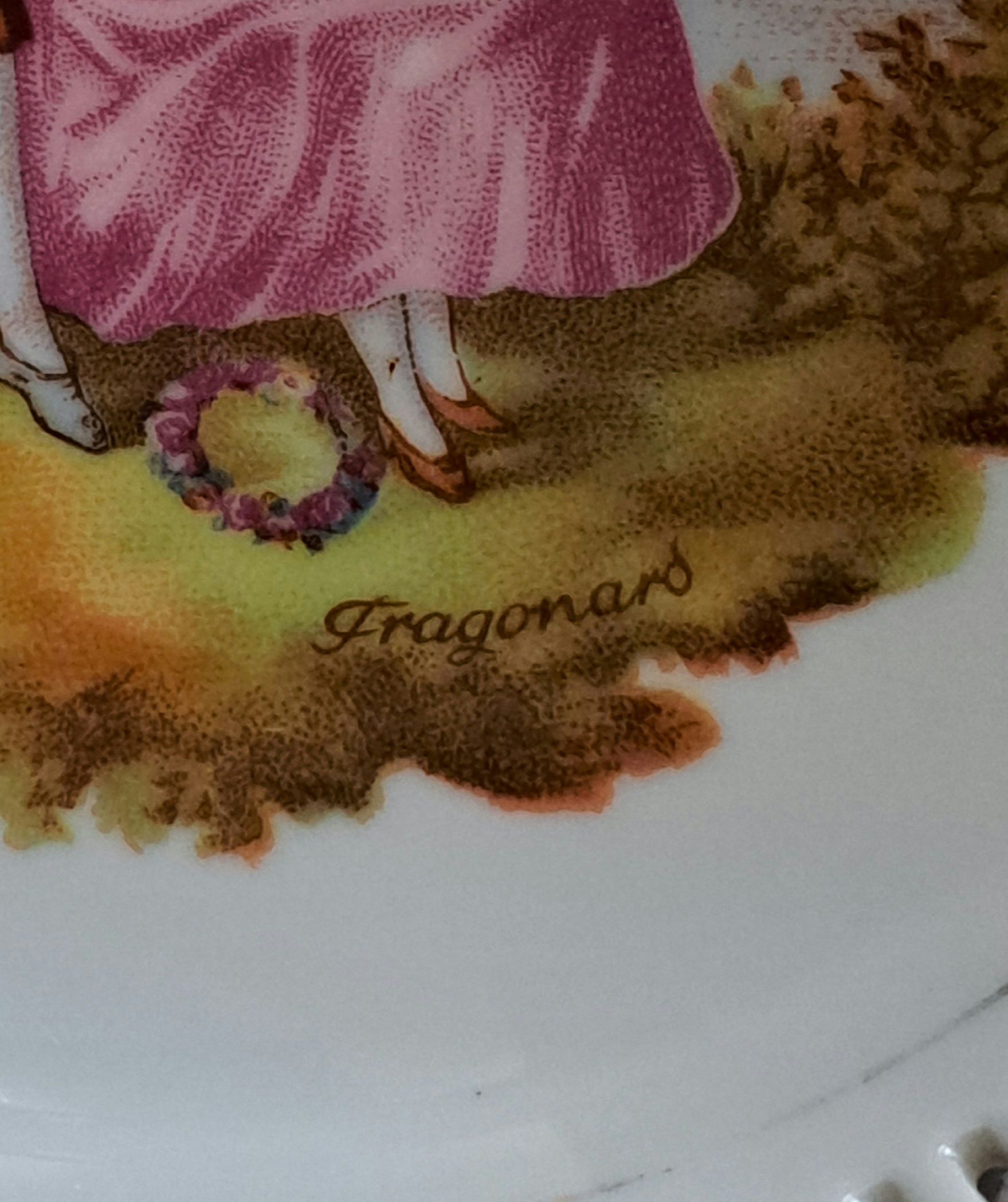 Mooie schaal met romantische afbeelding en open gewerkte rand, van Bavaria Fragonard. De goudkleurige bies in de