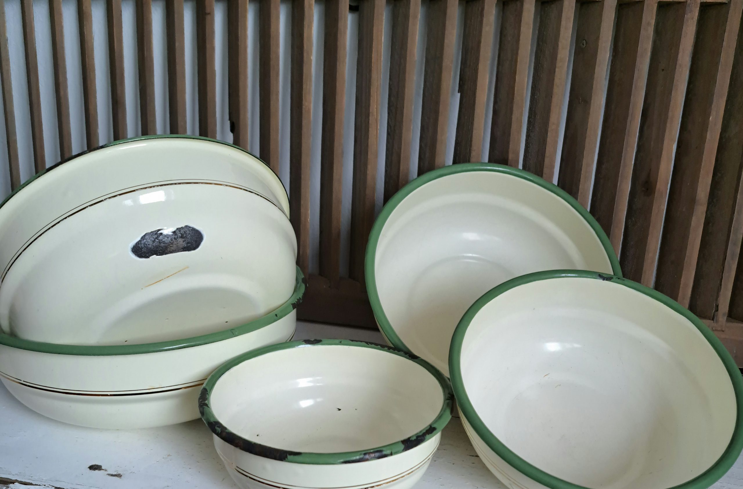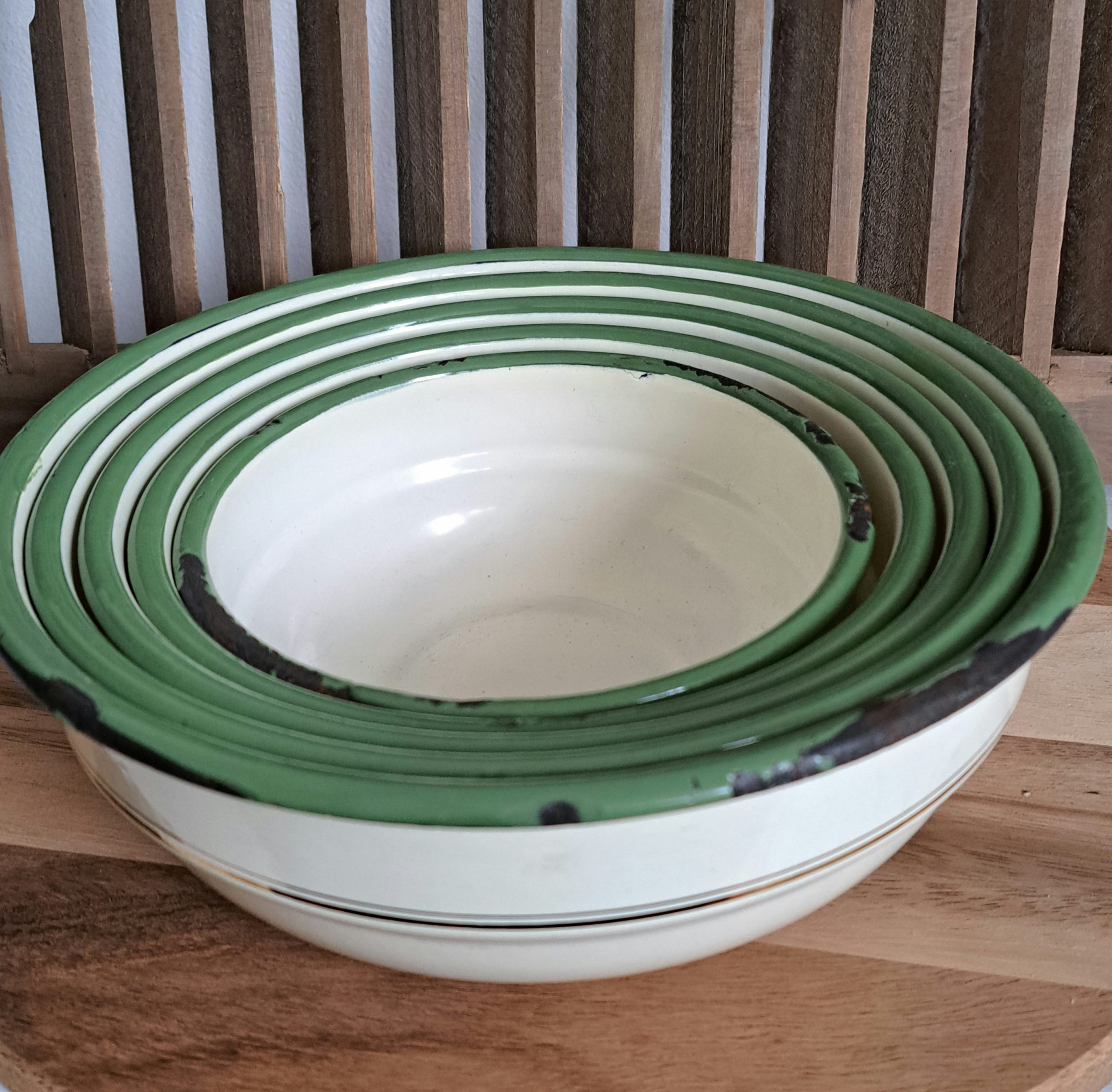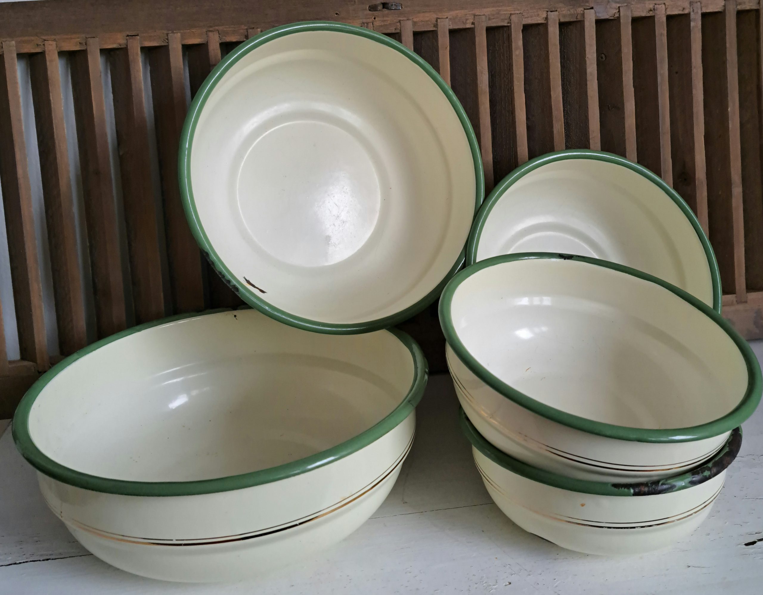 Set van 5 emaille nestschalen. Ø 15cm,17cm,19cm,21cm en 24cm. Er zijn wat sporen van ouderdom te zien, de schaal van 19 cm heeft alleen lichte krasjes aan de onderkant.