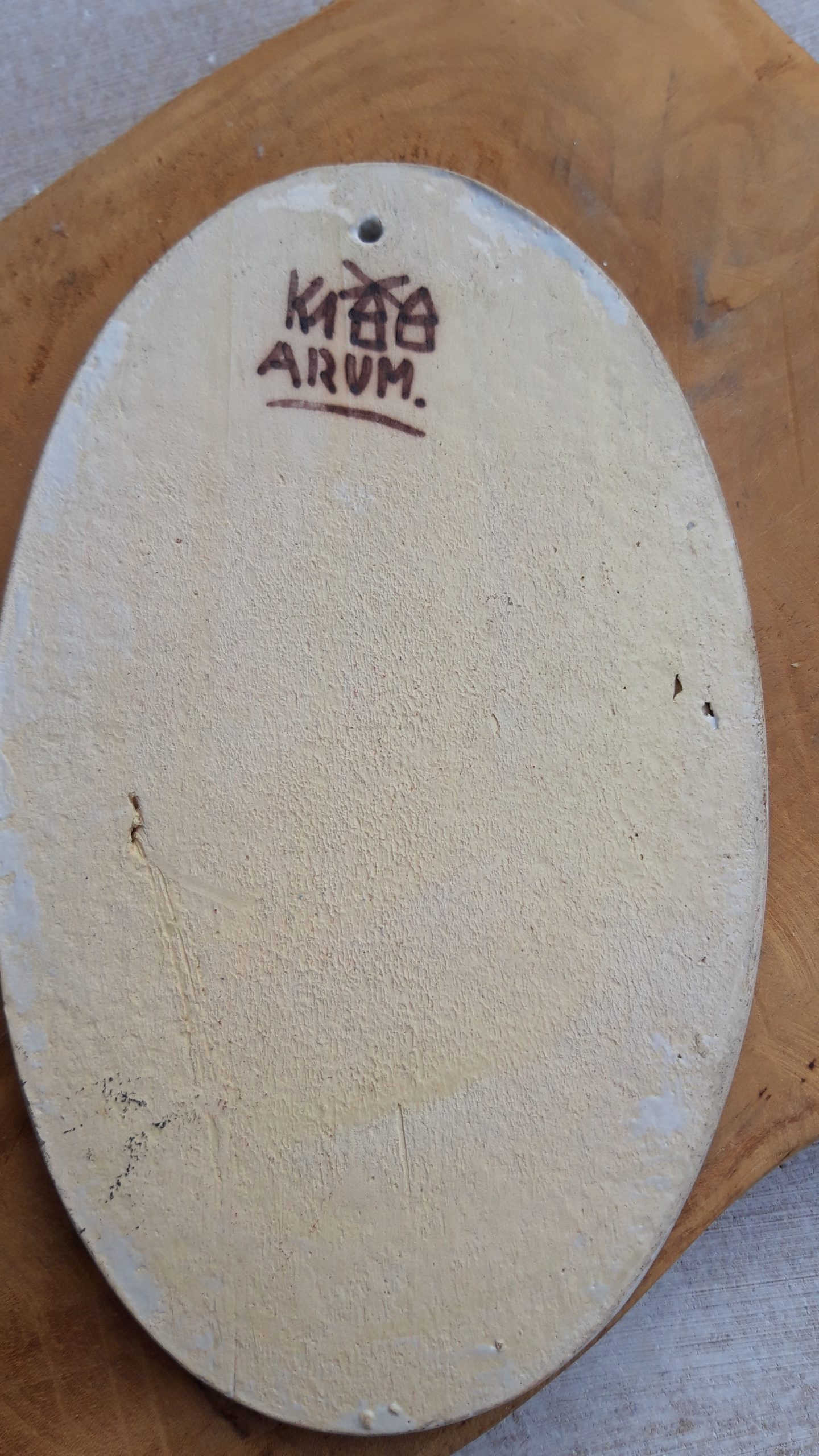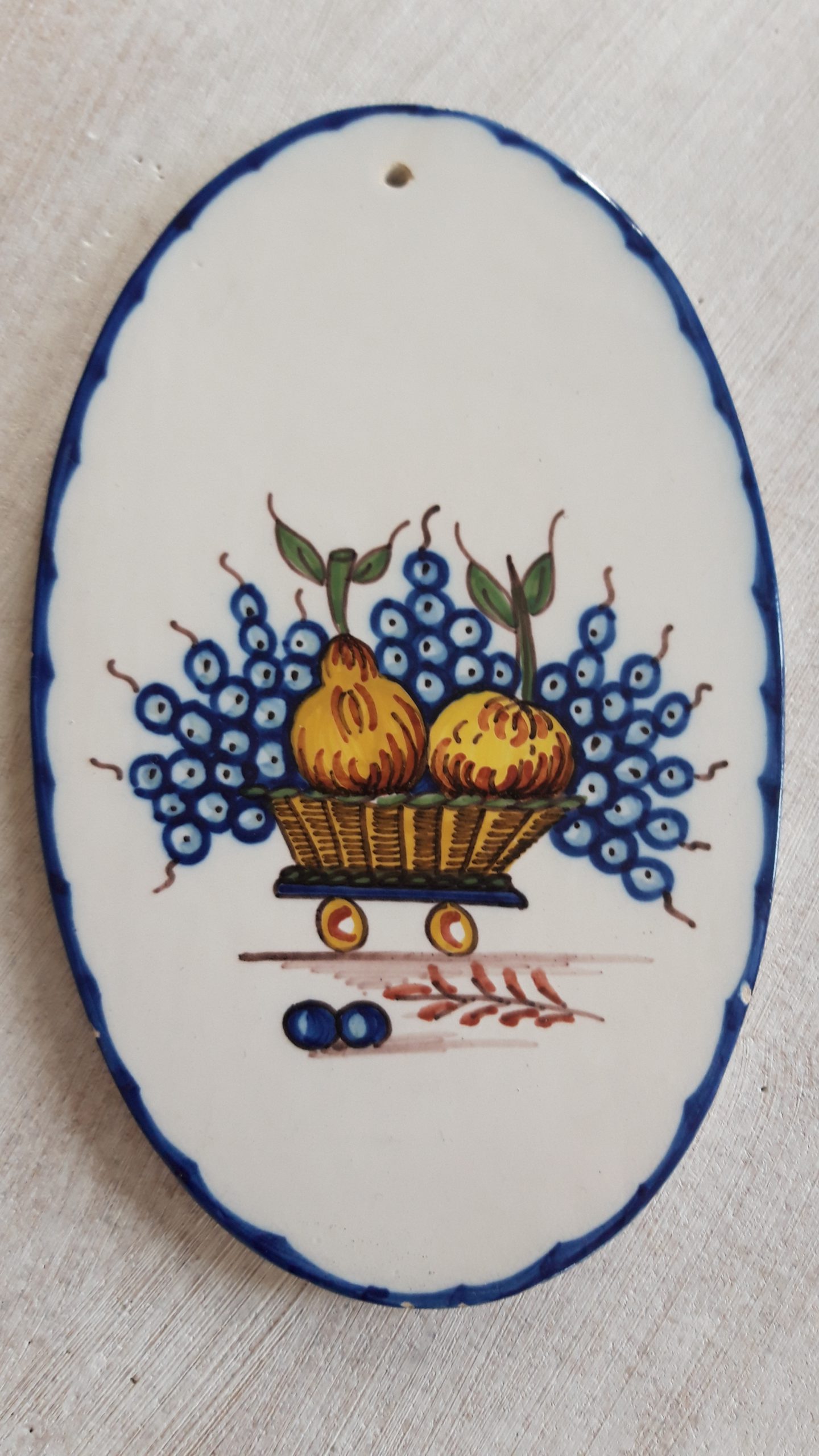 Ovaal tegeltje met fruitmand motief en een blauwe rand. 20 cm lang, 12 cm breed, 1 cm dik (Brievenbuspakketje 3,95)