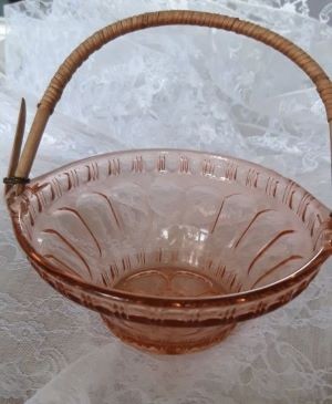 Vintage (bonbon) schaaltje van roze glas en bamboe handvat