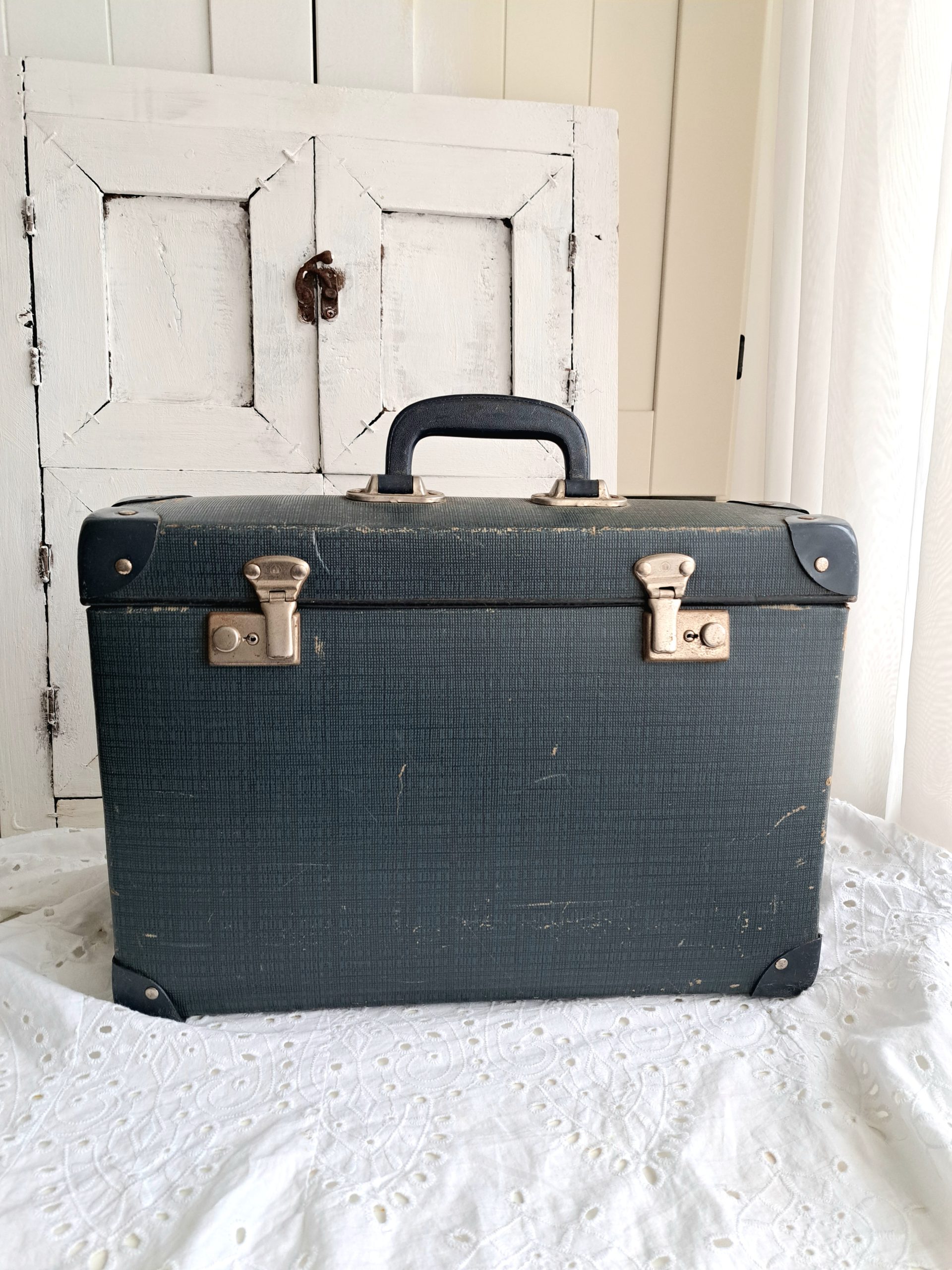Blauw vintage koffertje. Erg leuk om mee te decoreren,bijvoorbeeld door meerdere vintage koffers te stapelen. De koffer is in gebruikte staat maar de sluitingen werken nog prima.