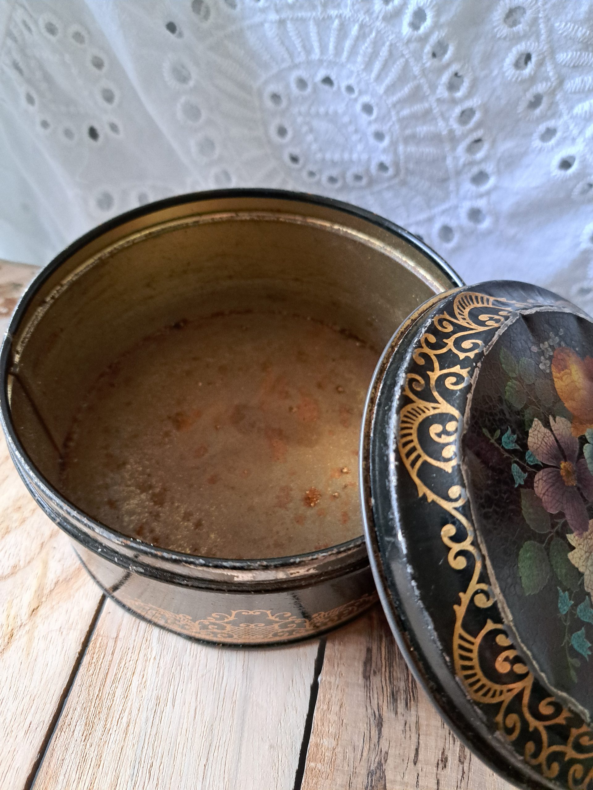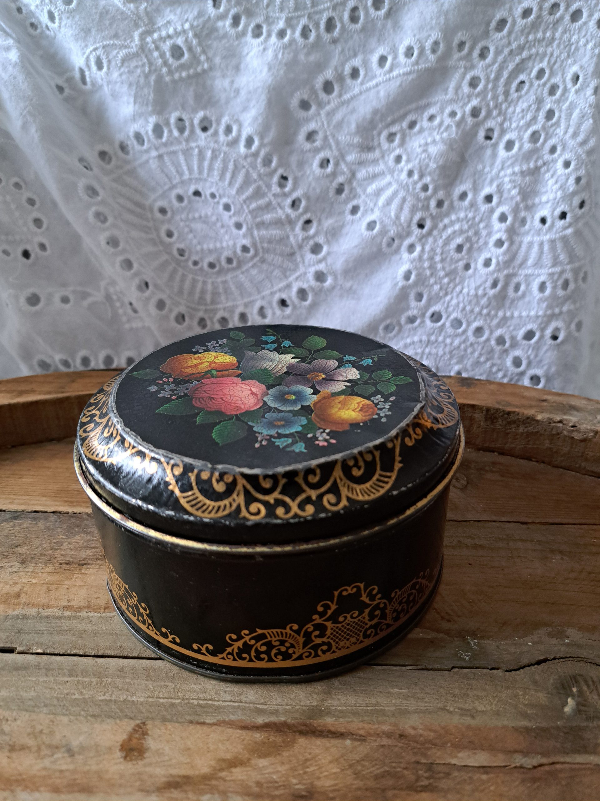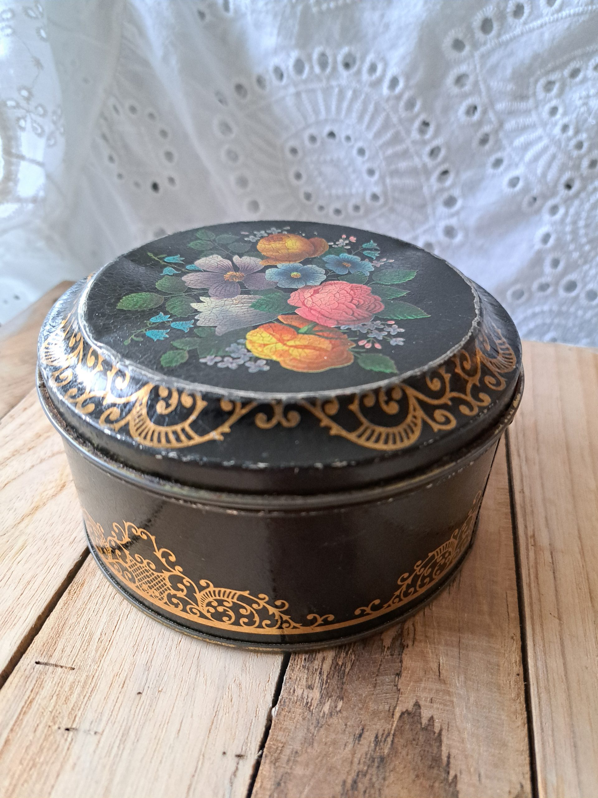 Oud rond blik, zwart met bloemetjes motief.