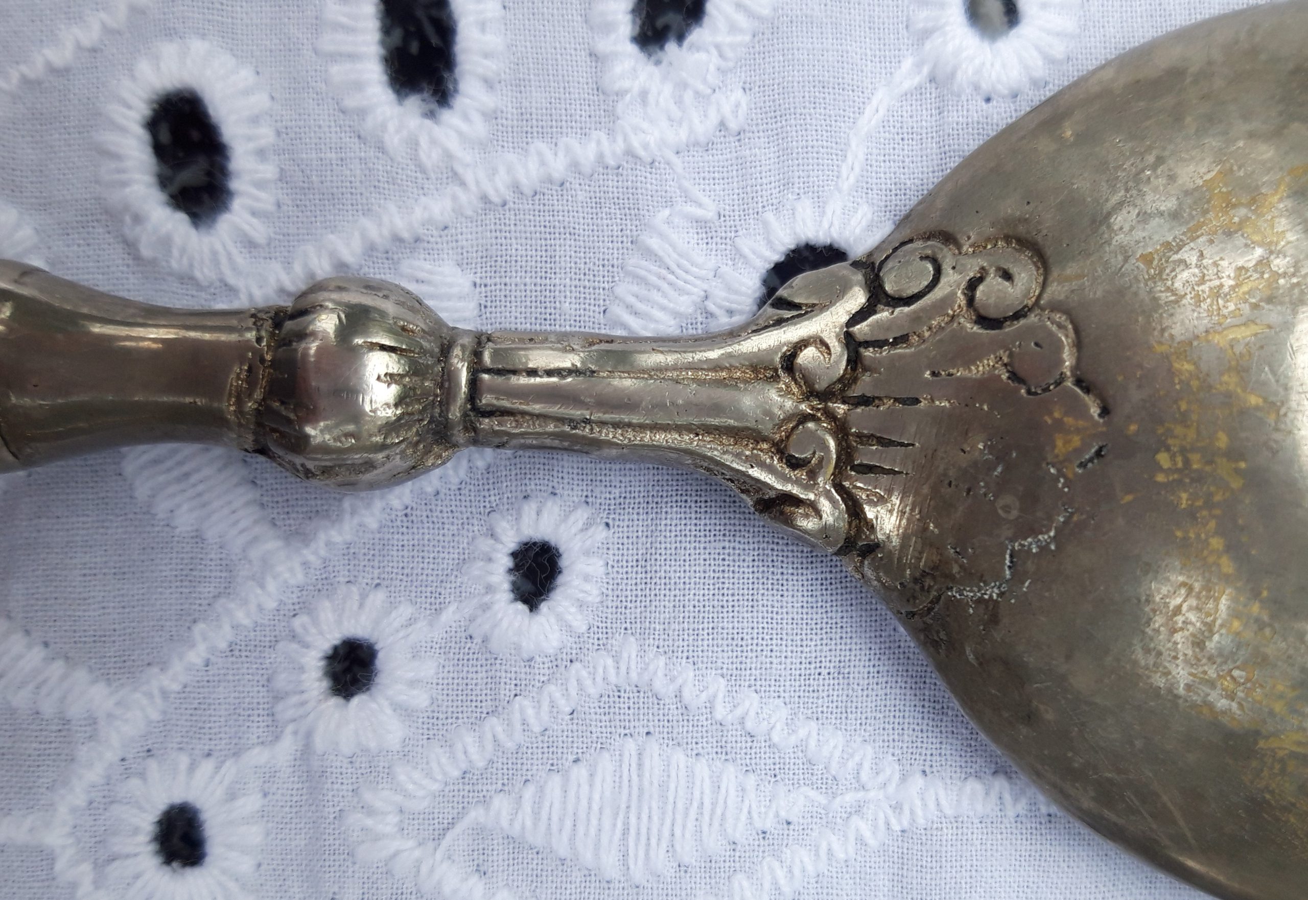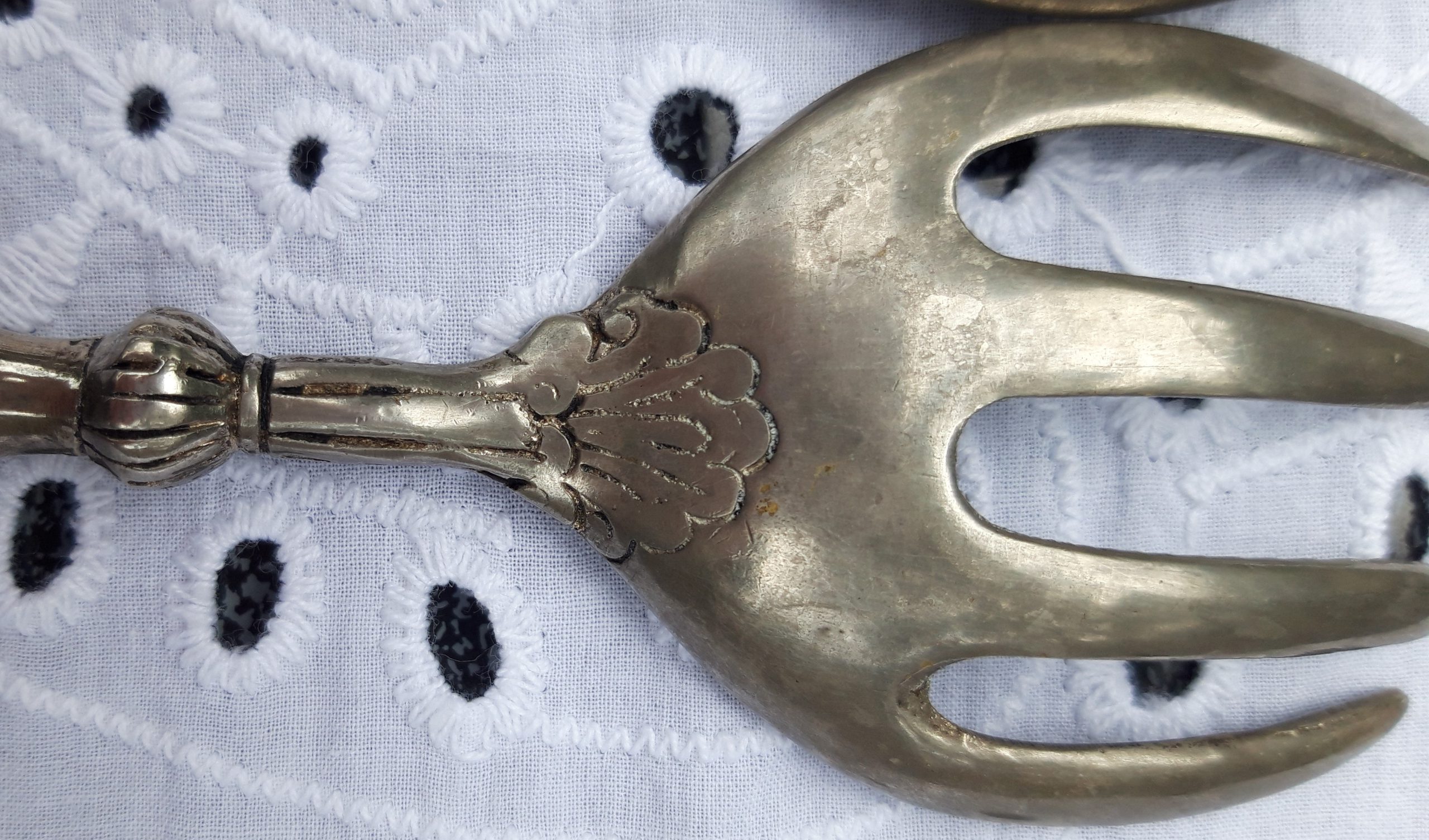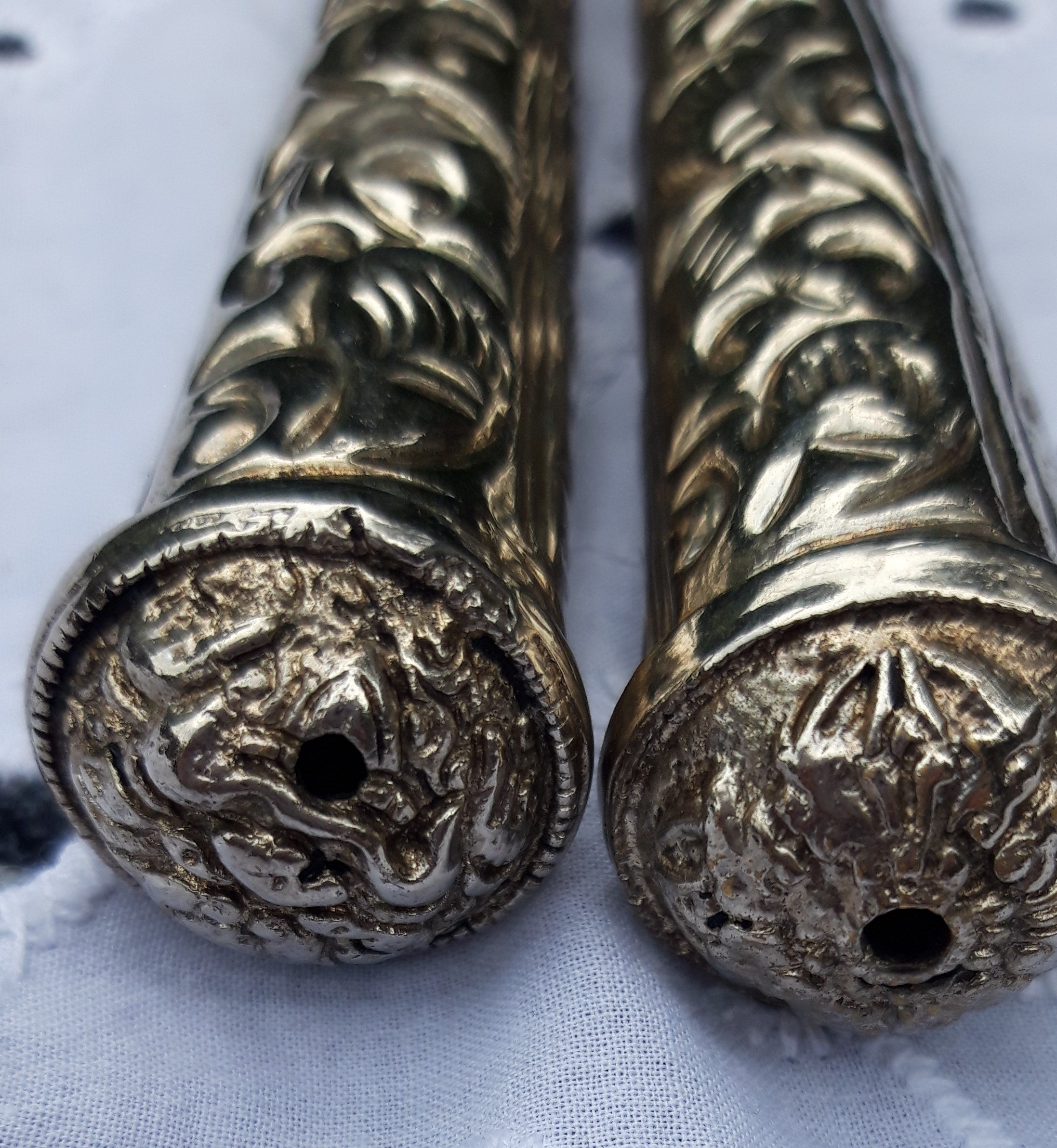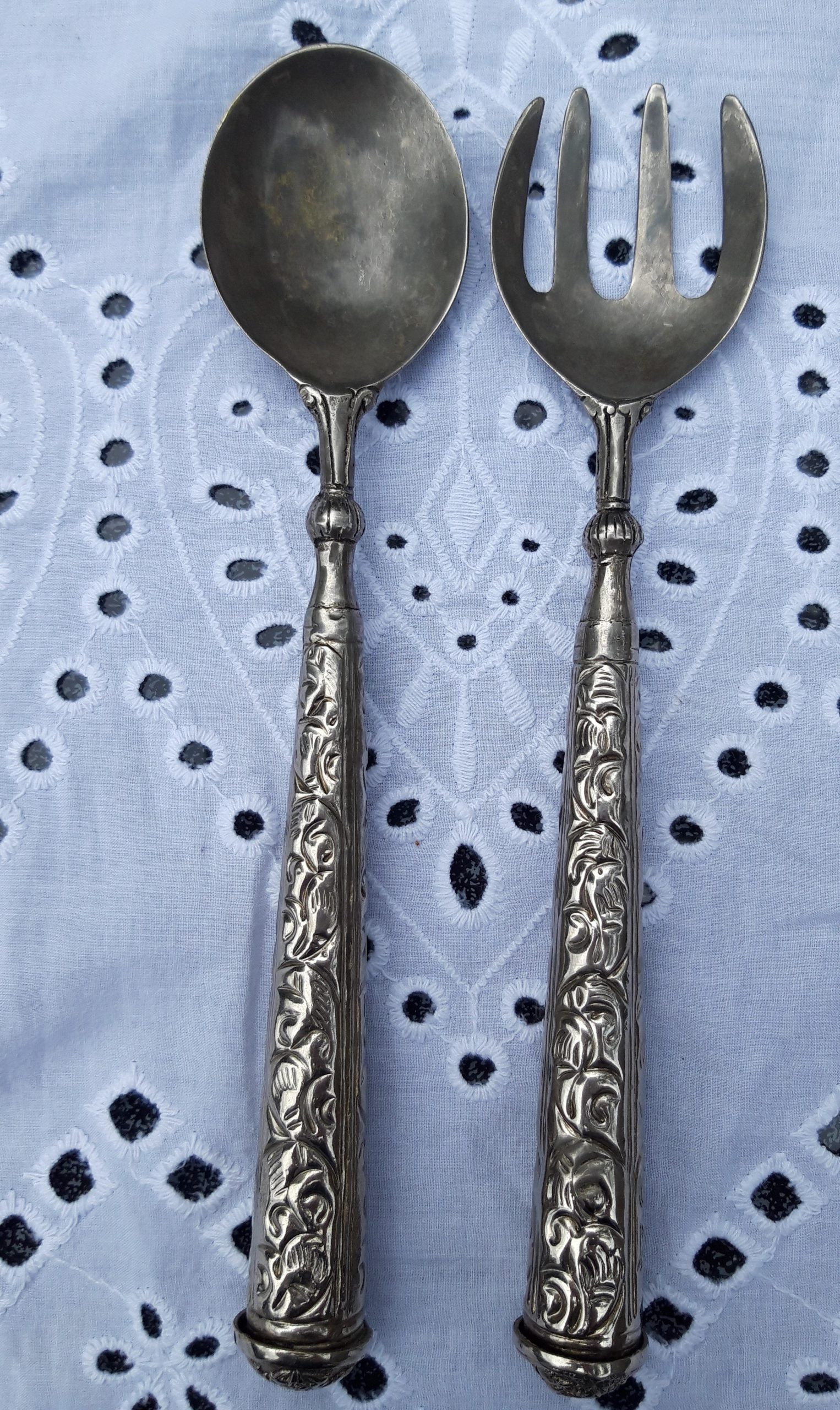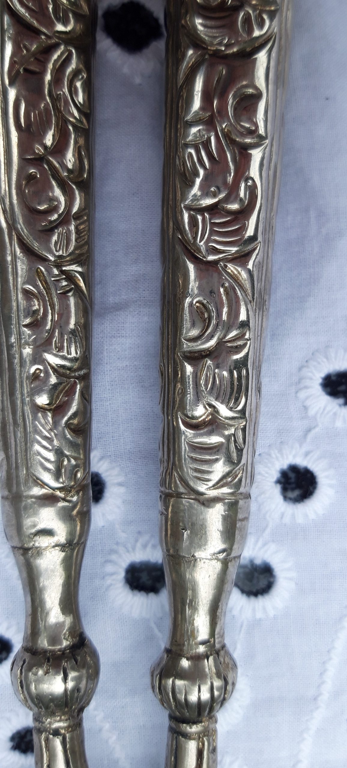 Rijk gedecoreerd vintage verzilverd slabestek met een barok uitstraling. Beide zijn 24 cm lang, het gewicht is 151 gram.