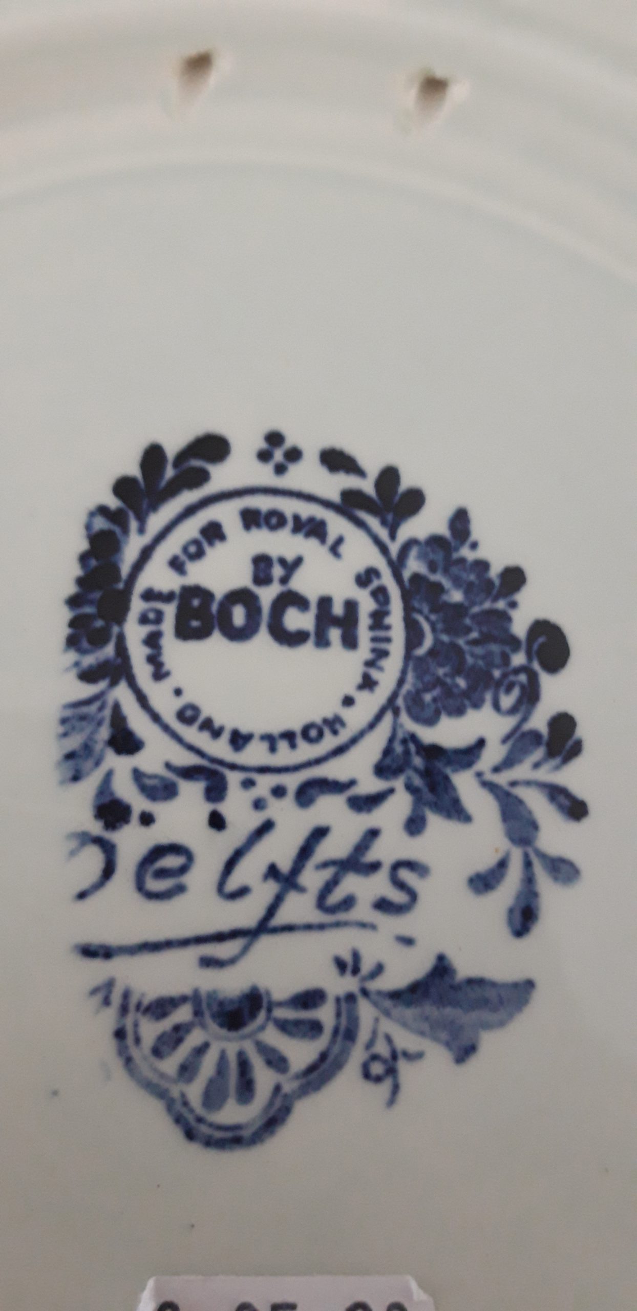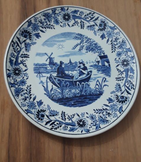 Delftsblauw wandbord, Made For Royal Sfinx By Boch met een oud Hollandse tafereel van een koppel in een roeiboot met een windmolen op de achtergrond. De diameter is 21 cm. Het bord is helemaal puntgaaf.