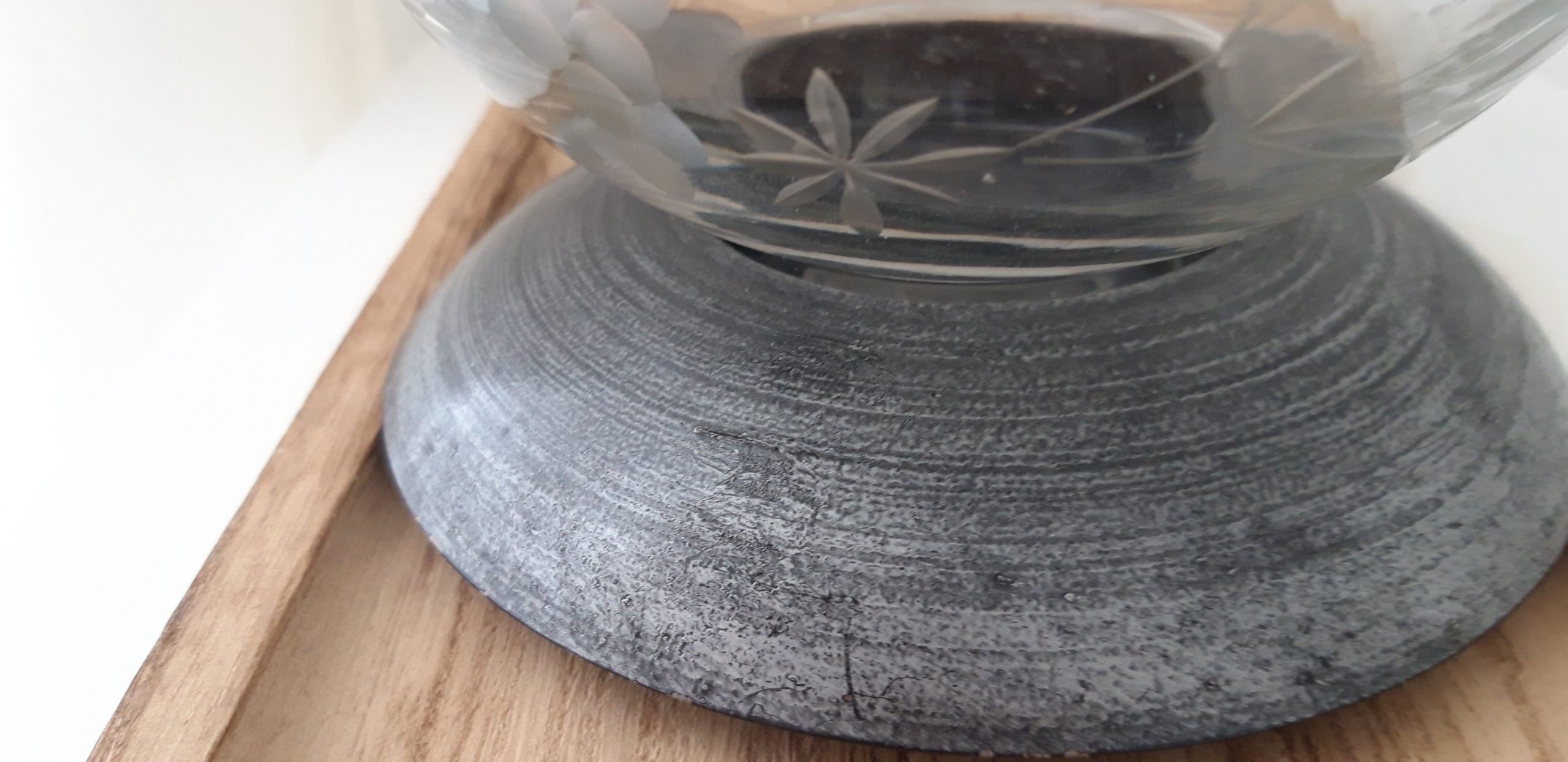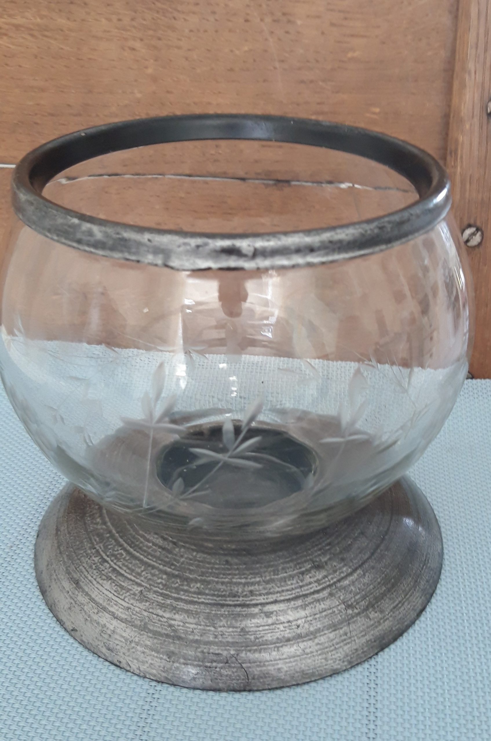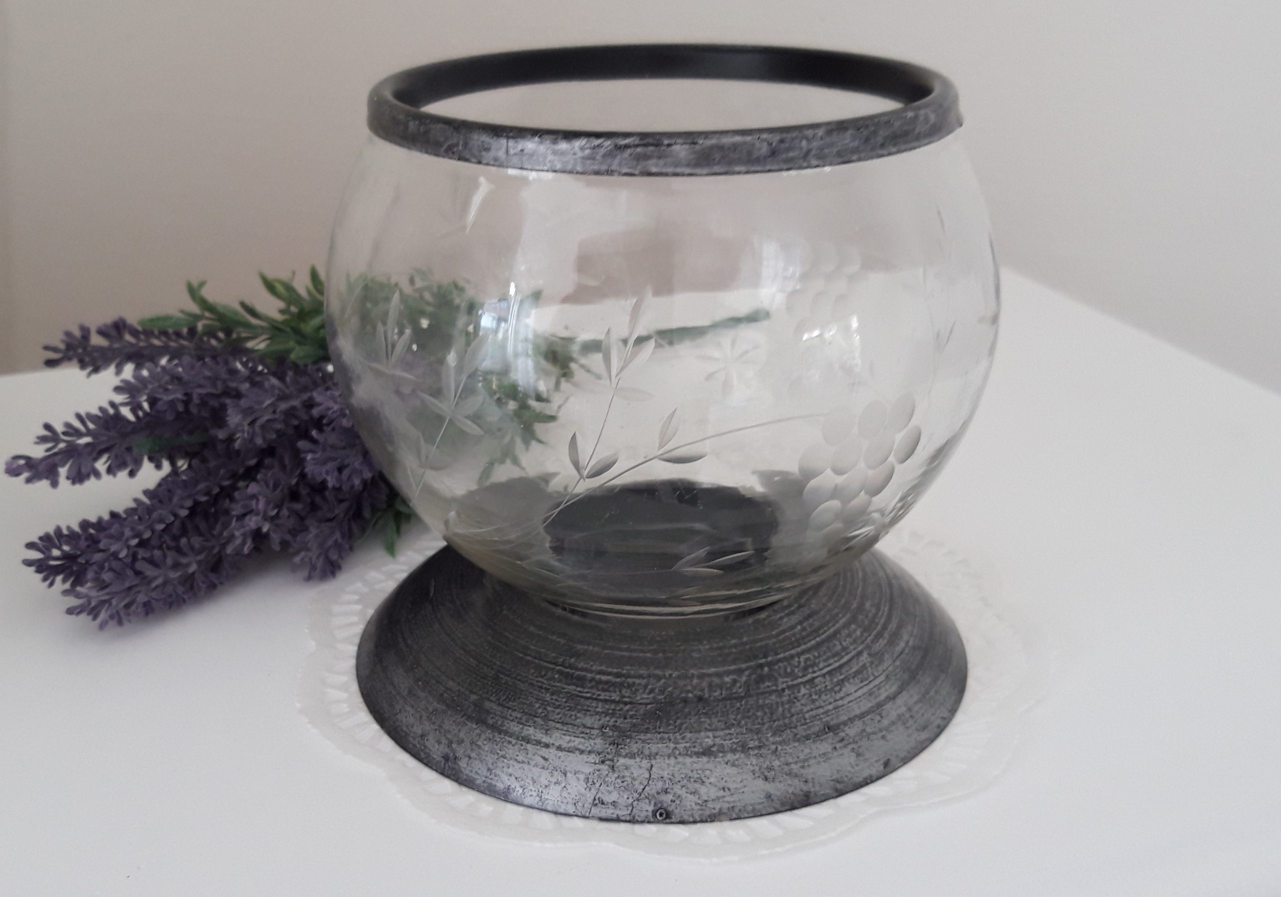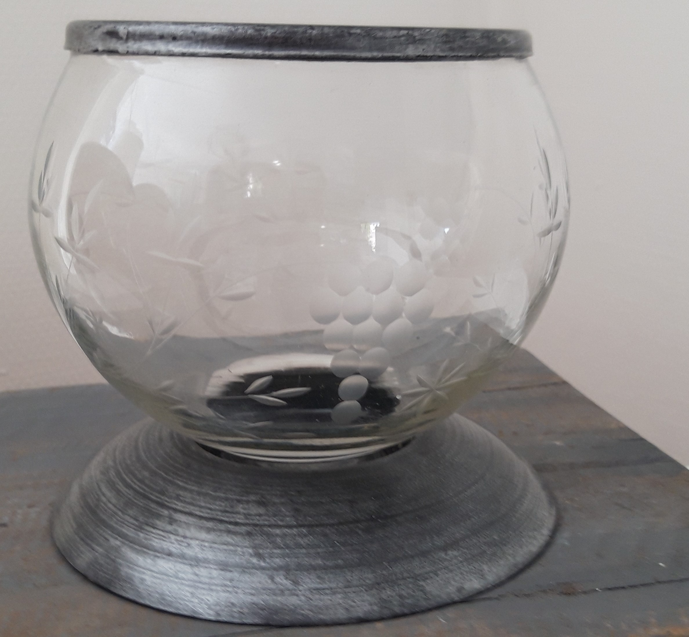 Bolvormig glazen windlicht op metalen voet. In het glas zijn figuurtjes geslepen van blaadjes en druiventrossen. De doorsnede van de voet is 15 cm. De hoogte is 14 cm. Er past een maxi waxine lichtje in